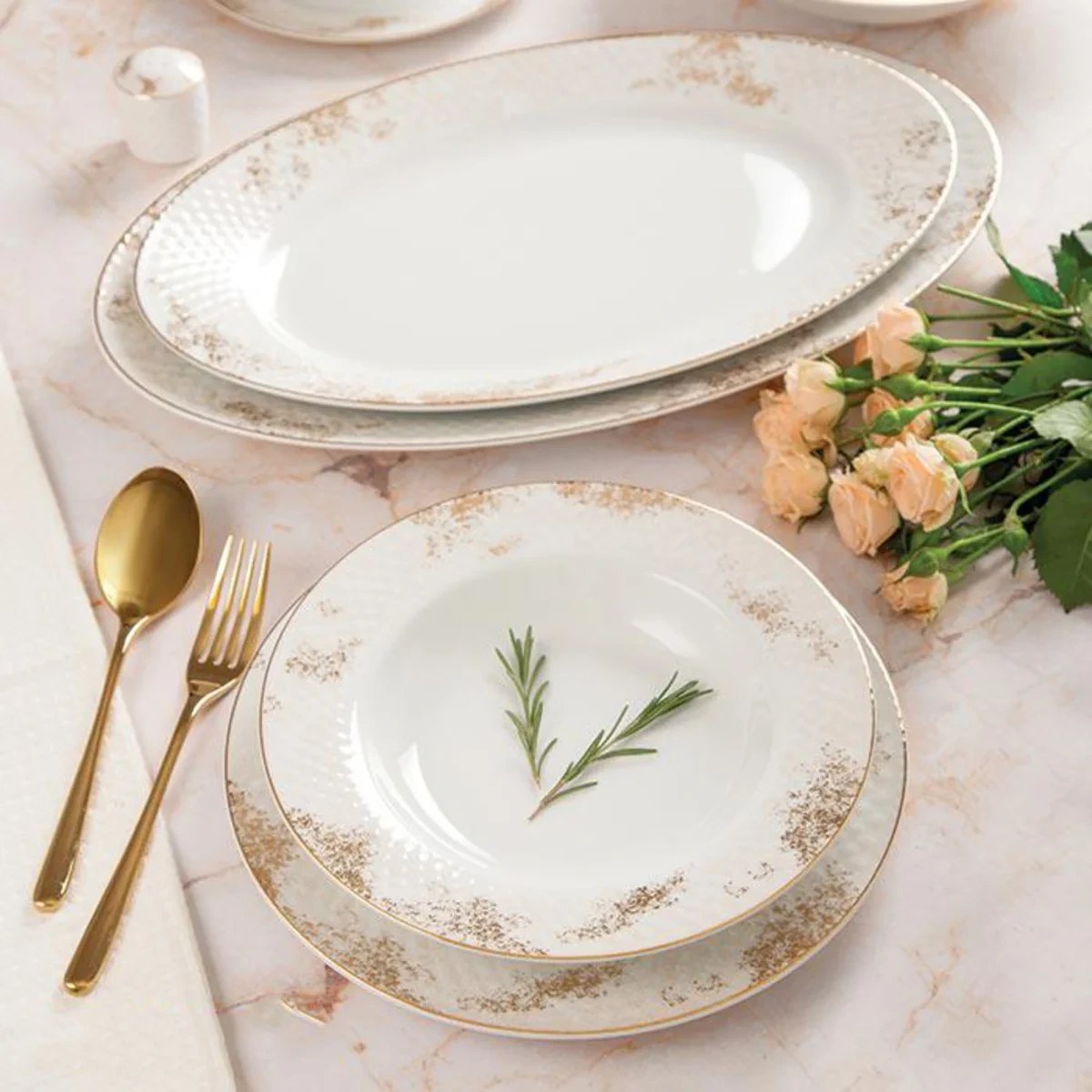 دیس: دو عدد بشقاب غذا خوری: شش عدد با قطر 25 سانتیمتر بشقاب خورش خوری: شش عدد با قطر 23 سانتیمتر بشقاب میوه خوری: شش عدد با قطر 19 سانتیمتر سالاد خوری کوچک: شش عدد با قطر 15 سانتیمتر نمک پاش: یک عدد با گنجایش 38 سی سی فلفل پاش: یک عدد با گنجایش 38 سی سی