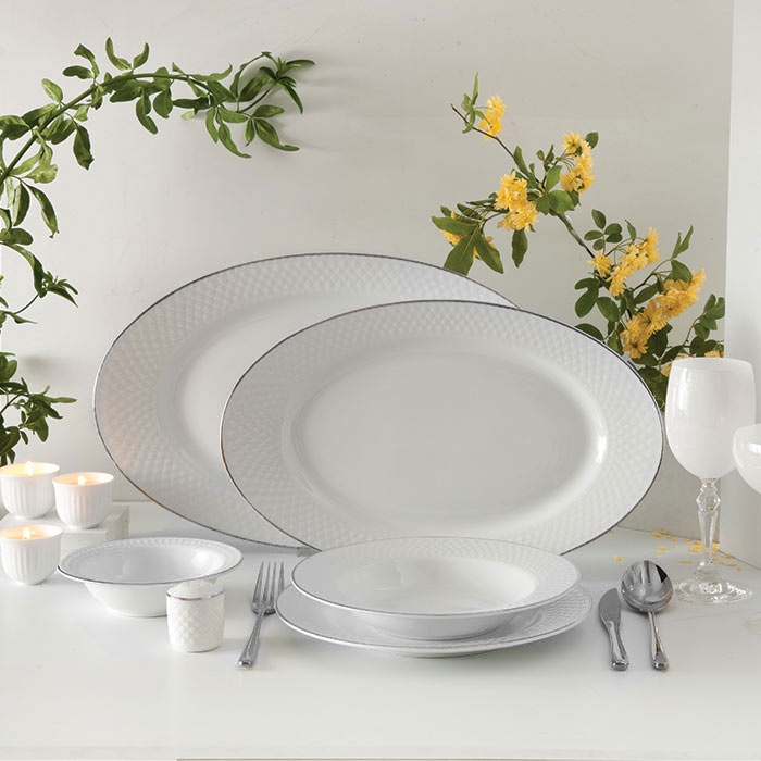 دیس: دو عدد بشقاب غذا خوری: شش عدد با قطر 25 سانتیمتر بشقاب خورش خوری: شش عدد با قطر 23 سانتیمتر بشقاب میوه خوری: شش عدد با قطر 19 سانتیمتر سالاد خوری کوچک: شش عدد با قطر 15 سانتیمتر نمک پاش: یک عدد با گنجایش 38 سی سی فلفل پاش: یک عدد با گنجایش 38 سی سی