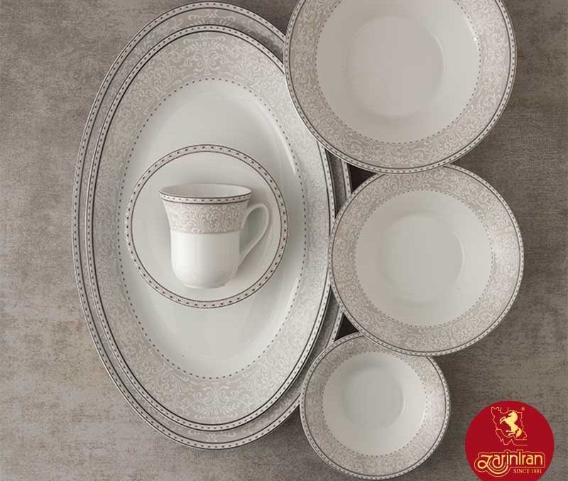 دیس: دو عدد با قطر + سانتیمتر بشقاب غذا خوری: شش عدد با قطر 27 سانتیمتر بشقاب خورش خوری: شش عدد با قطر 23 سانتیمتر بشقاب میوه خوری: شش عدد با قطر 20 سانتیمتر سالاد خوری بزرگ: یک عدد با قطر 26 سانتیمتر سالاد خوری کوچک: شش عدد با قطر 14 سانتی متر پیاله 18: شش عدد با قطر 18 سانتی متر نمک پاش: یک عدد با گنجایش 40 سی سی فلفل پاش: یک عدد با گنجایش 20 یا 40 سی سی
