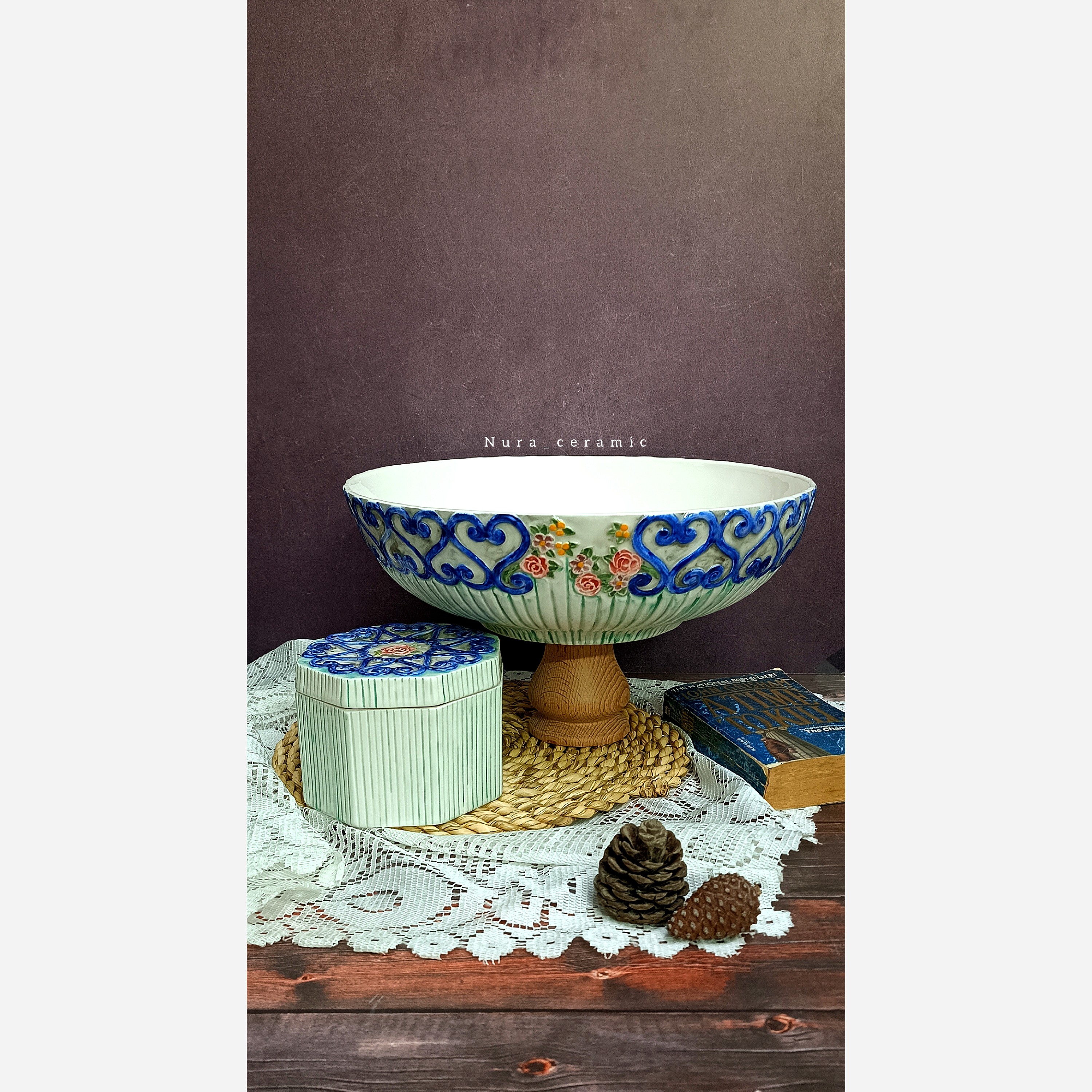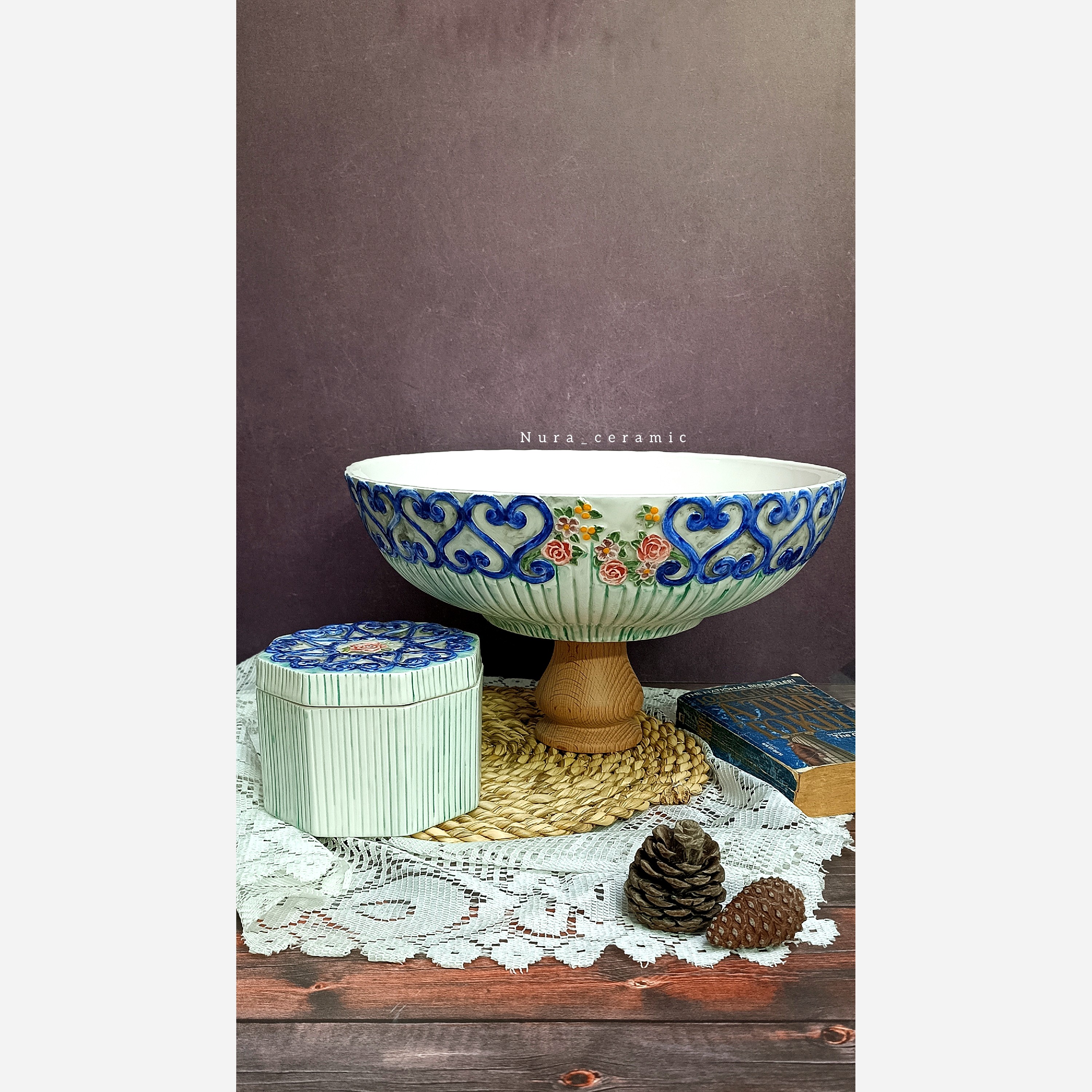 میوه خوری و شکلات خوری سرامیکی کاملاً دست ساز نقاشی زیرلعابی تکنیک کندهکاری قابل شستشو پخت شده با دمای بالای 1080