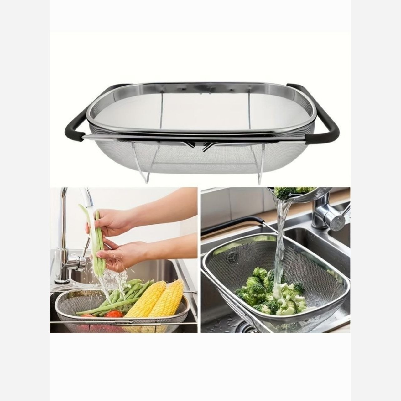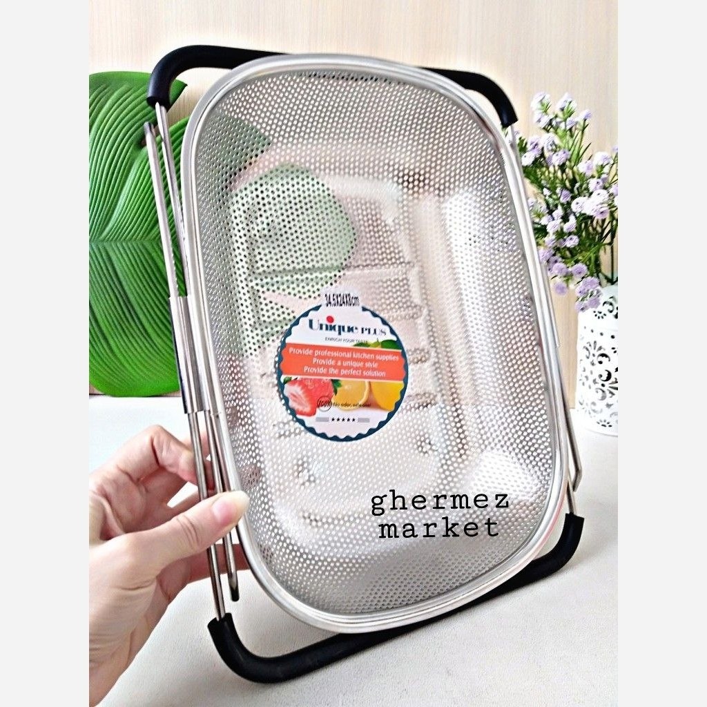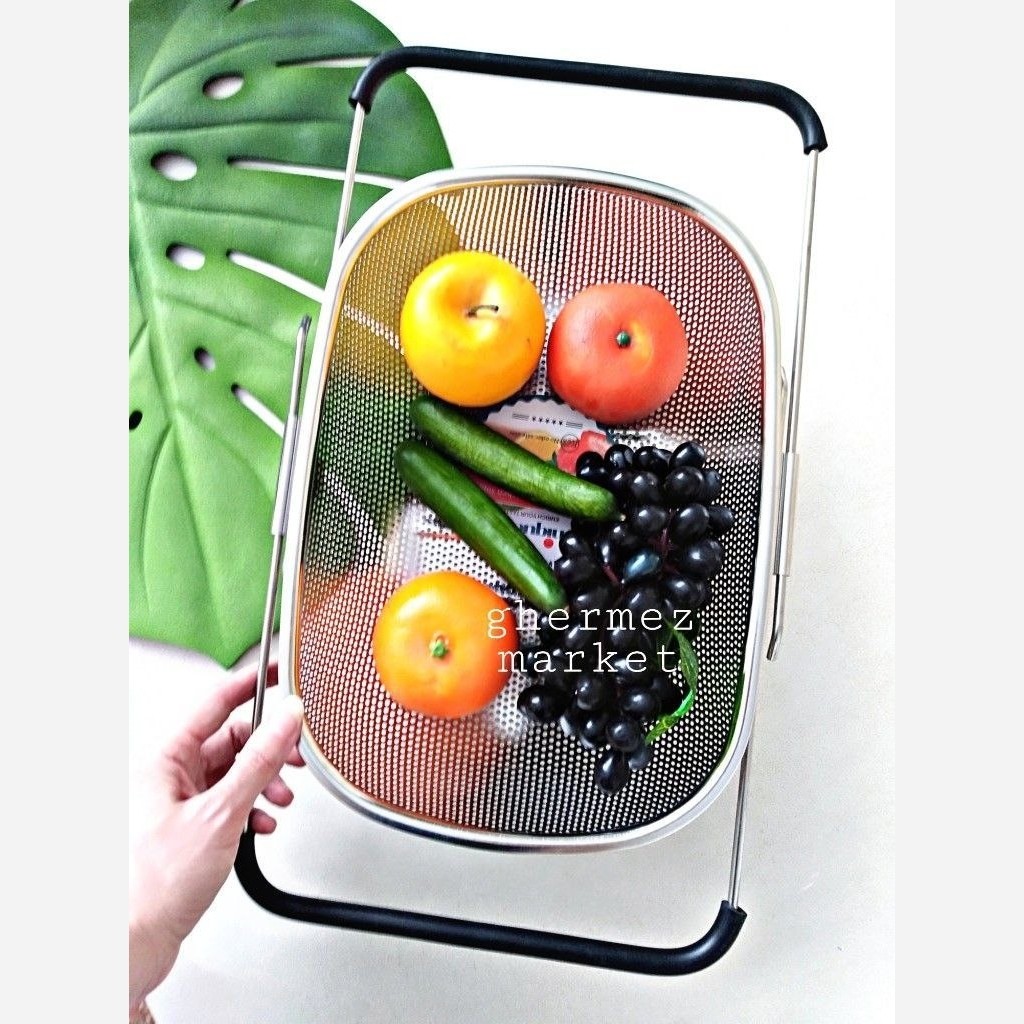 🍅🍍 آبکش سینک خارجی 🍇🍏 ✔ کشویی و با قابلیت تنظیم به اندازه سینک ظرفشویی شما👌 💯 صد در صد استیل 💯 ابعاد سبد آبکش 24×35 سانتیمتر دسته ها بصورت کشویی تا طول 53 سانتیمتر باز میشن👌 ارتفاع سبد آبکش 8 سانتیمتر