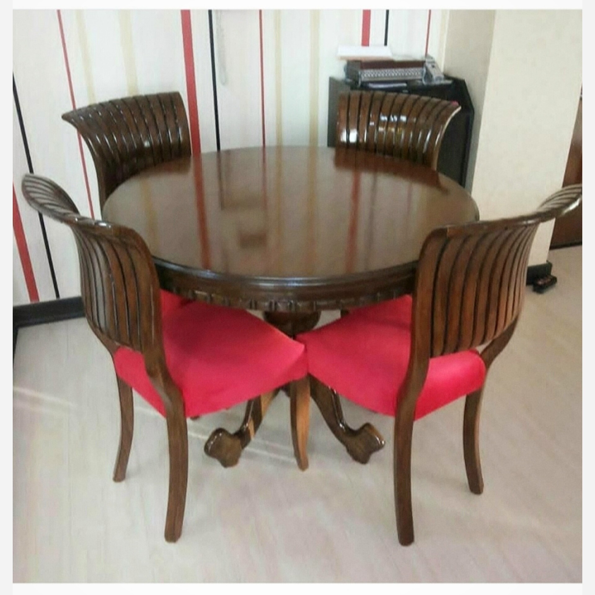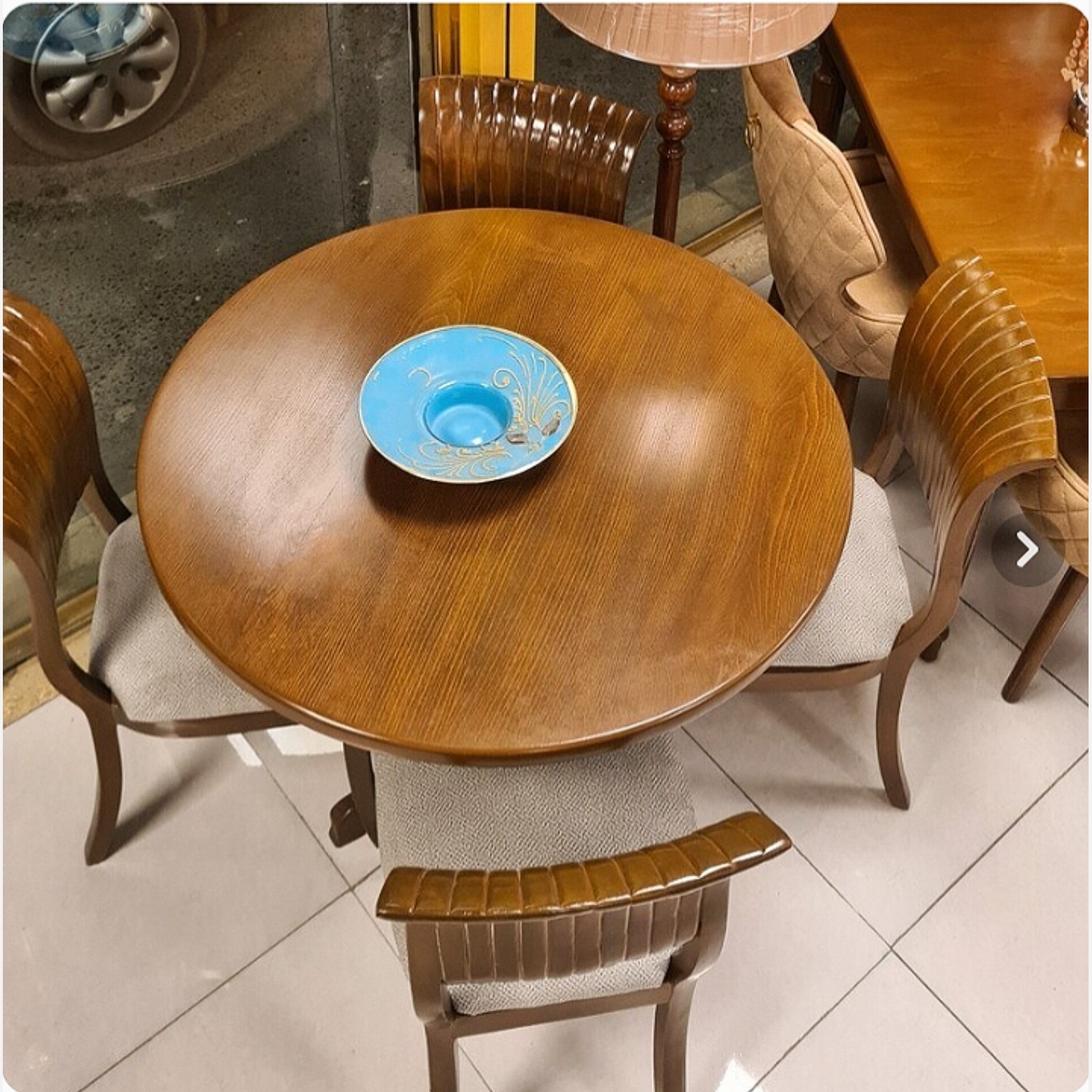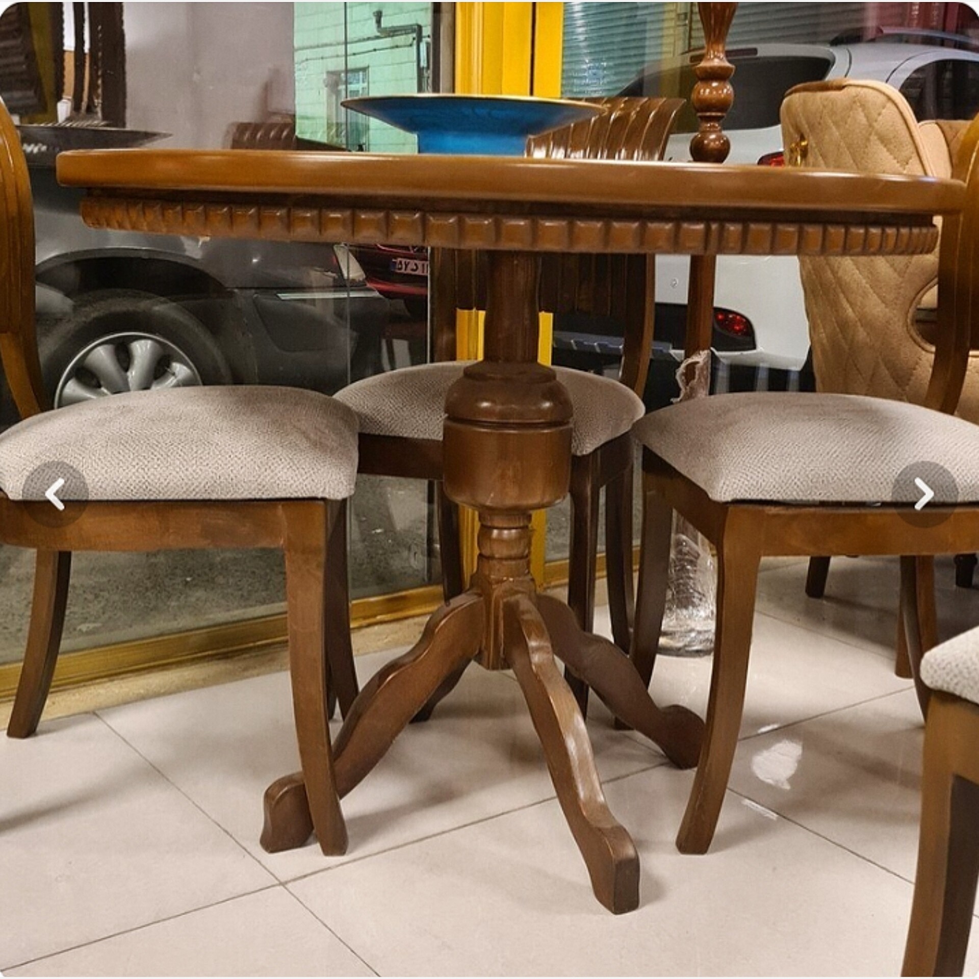 میز و صندلی ناهارخوری 4 نفره مدل صدفی جنس چوب روس ابعاد 90×90×80 34×34×50 صفحه قابل جداشدن و قید دار نشیمن اسفنج پارچه دیاموند