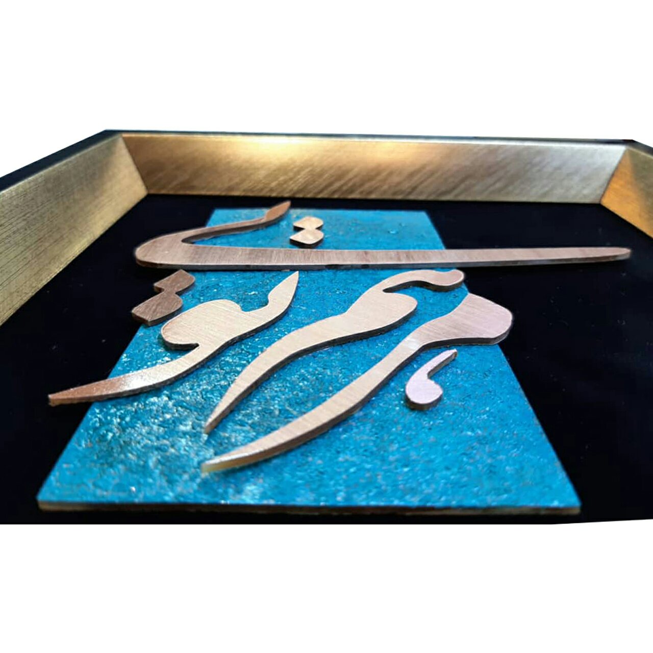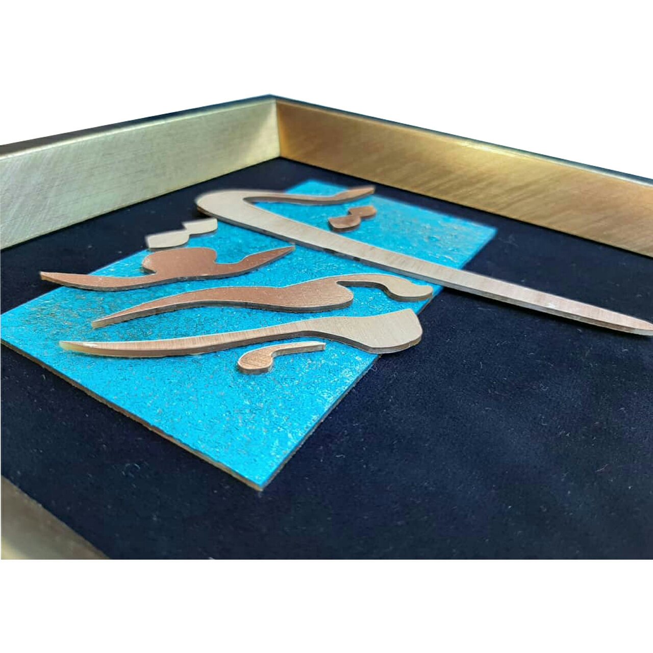 در این تابلو تمام حروف با دست بریده شده است. جنس حروف از مس است. زمینه رنگی اثر همان مس است که در فرایند اسید کاری به رنگ فیروزه ای تبدیل می شود و استفاده از آن در تابلو باعث جلوه و زیبایی دوچندان آن شده است. استفاده از پوشش مناسب کیلر روی طرح نوشته و پتینه کار موجب عمر طولانی کار و عدم تغییر رنگ آن در دراز مدت شده است. زمینه اصلی کار چوب ام دی اف سه میل است که روی آن پارچه جیر با کیفیت مشکی چسبانده شده و پتینه و طرح نوشته روی آن اجرا شده است. این تابلو با یکی از بهترین قاب های pvc بازار قاب شده که دارای کیفیت فوق العاده و رنگ جذاب است. این اثر در بسته بندی کارتن و دارای شیشه دو میل روی قاب تقدیم شما می شود. طراحی این کار به گونه ای است که خروجی آن یک تابلو با ترکیب رنگی جذاب و ترکیب بندی خلاقانه است. در این تابلو با استفاده از مواد با طبیعی مثل مس و استفاده از مواد اولیه درجه و همچنین اجرای کم نقص کار موجب جلوه و زیبایی تابلو شده که هر کسی آن را مشاهده کند به آن اقرار میکند. در کل این کار با استفاده از طراحی حرفه ای و اجرای کم نقص دست به محصولی زیبا و جذاب برای دکور و ... و یا به عنوان هدیه برای آنان که دوستشان دارید تبدیل شده است. ابعاد تابلو 24*24 است. ارسال رایگان