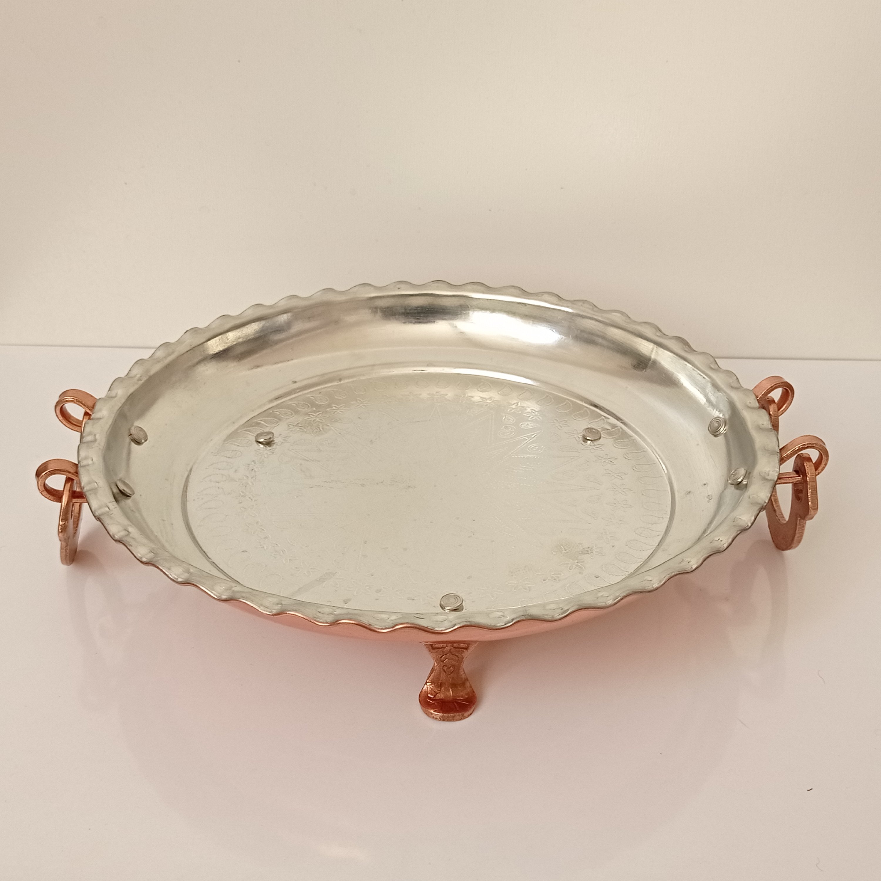 این دیس مسی برای پلو و برنج مناسب هست .دارای سه پایه کوتاه مسی و دو دسته مسی برای حمل دیس هست و قسمت مسی رنگ آن نانو شده تا سیاه نشه.بهترین کیفیت از نظر وزنی و اندازه میباشد