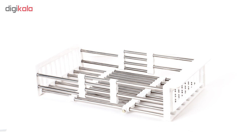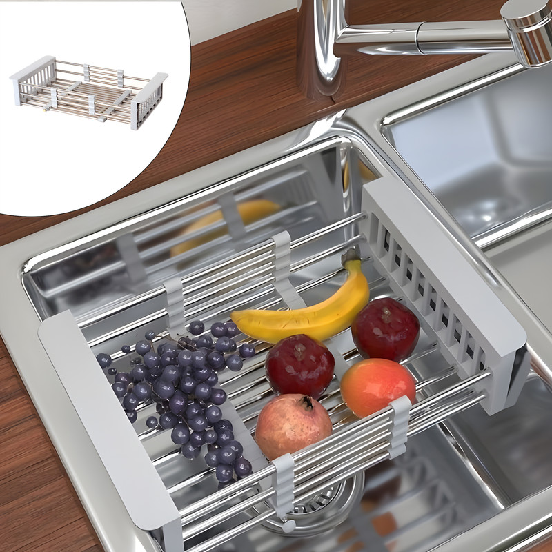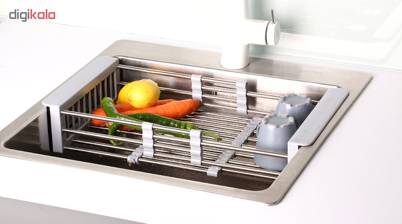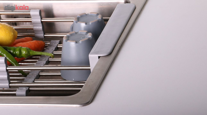 آبگیر سینک یک وسیله کاربردی برای استفاده روی سینک ظرفشویی آشپزخانه شما است . اگر سینک ظرفشویی آشپزخانه تان کوچک است و فضای کافی برای قرار دادن ظروف ، میوه و سبزیجات شستشه شده را برای آبگیری ندارید آبگیر سینک تاشو گلدونه با قابلیت جمع شدن به صورت رولی جهت اشغال فضای کمتر ممکن است برایتان مناسب باشد. جنس بدنه آبگیر سینک تاشو از استیل با کیفیت و دارای لبه های ضد لغزش از جنس پلاستیک ضد باکتری که به راحتی بر روی سینک خیس ظرفشویی قرار گرفته و لیز نمی خورد. طراحی خاص این وسیله به شما این امکان را می دهد که به راحتی آن را به اندازه دلخواه در آورده و توسط پیچ تنظیم سایز آن را ثابت کنید و در صورت عدم استفاده ان را به کوچکترین حالت ممکن بازگردانید وتا زمان استفاده بعدی در فضای کمی نگهداری کنید.این محصول طراحی شده است تا از تمام فضاهای موجود در آشپزخانه نهایت استفاده صورت بگیرد. آبگیر سینک، وسیله ای است با کارایی بالا که مورد استفاده در هر خانه ایی می تواند باشد. موقع ظرف شستن یا میوه شستن یا تمیز کردن ماهی و …. فقط کافی است آبکش سینک را بر روی سینک آشپرخانه پهن بکنید و بعد از خشک شدن میوه یا سبزیجات میتوان به عنوان سبد داخل یخچال قرار دهید. این آبکش سینک ظرفشویی آشپزخانه از استیل ضد زنگ تهیه شده و بسیار مقاوم است.