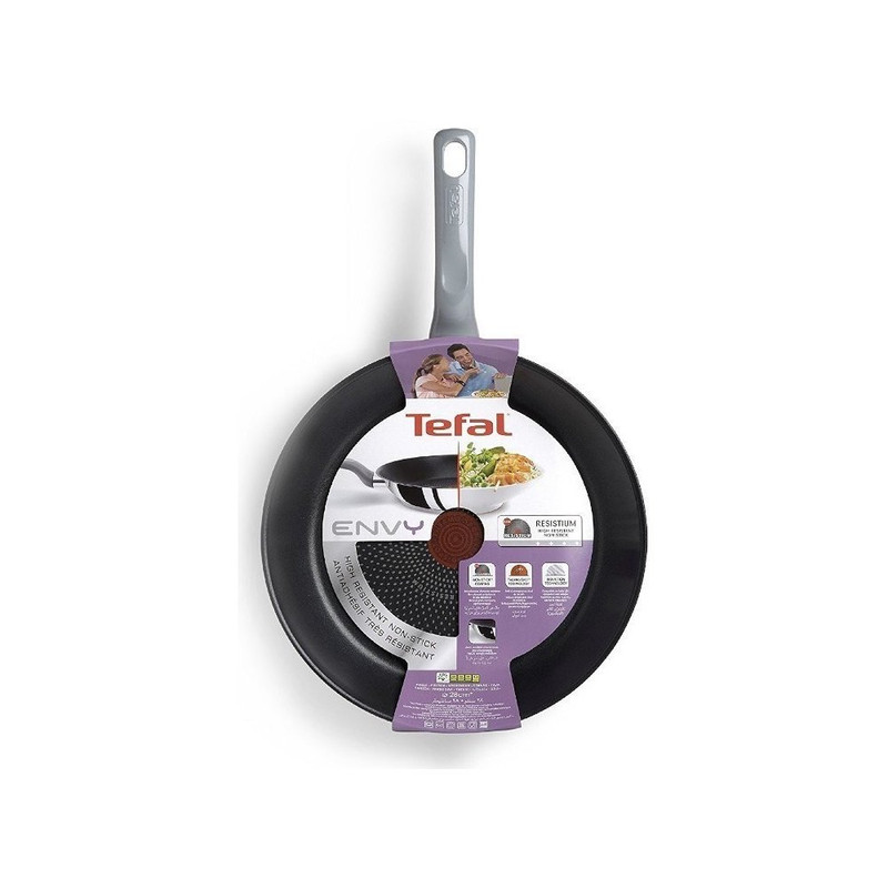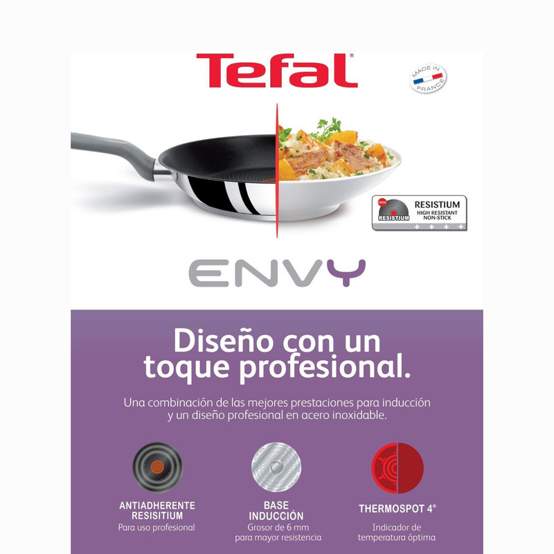 ماهیتابه Tefal ENVY با قطر 24 سانتی متر دارای رش نچسب مقاوم است که از چسبیدن غذا به کناره های تابه جلوگیری می کند. لایه بیرونی این ماهیتابه استیل است که جلوه ی خاصی به این محصول داده است. این مدل دارای نشانگر خاصی است که با آن می توانید به راحتی متوجه شوید که چه زمان تابه داغ است و آماده پخت غذای مورد نظر شماست. با توجه به ضخیم شدن قسمت پایین ، می توانید از این مدل در اجاق های گازسوز، برقی و القایی استفاده کنید. این ماهیتابه از آلومینیوم با کیفیت و با دوام ساخته شده است و همچنین با فولاد مخصوص پوشانده شده است ، که به لطف آن گرما به طور مساوی در کل سطح کار توزیع می شود و نیز به لطف رش مخصوص نچسب ، تمیز کردن ظرف بیش از چند دقیقه طول نمی کشد.
