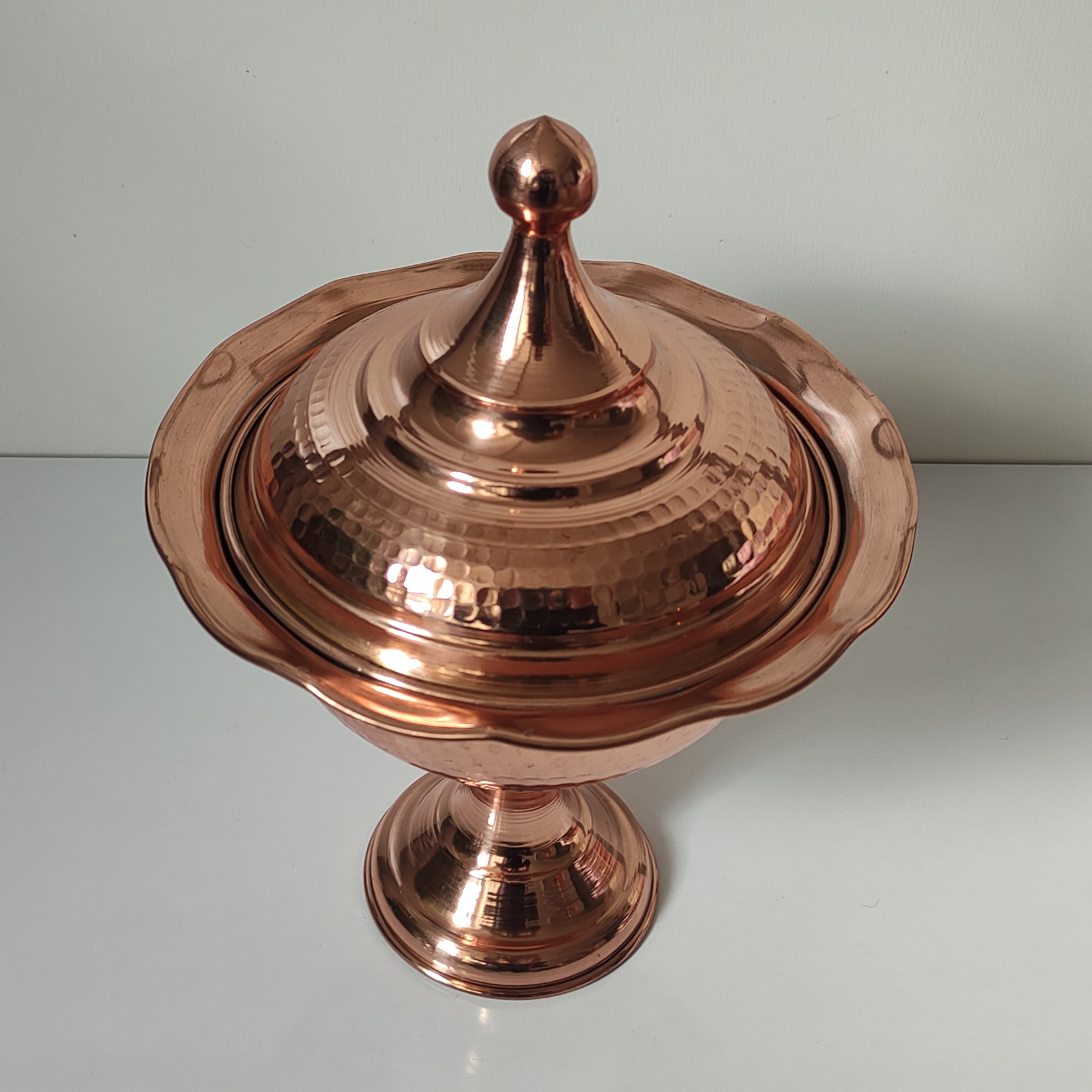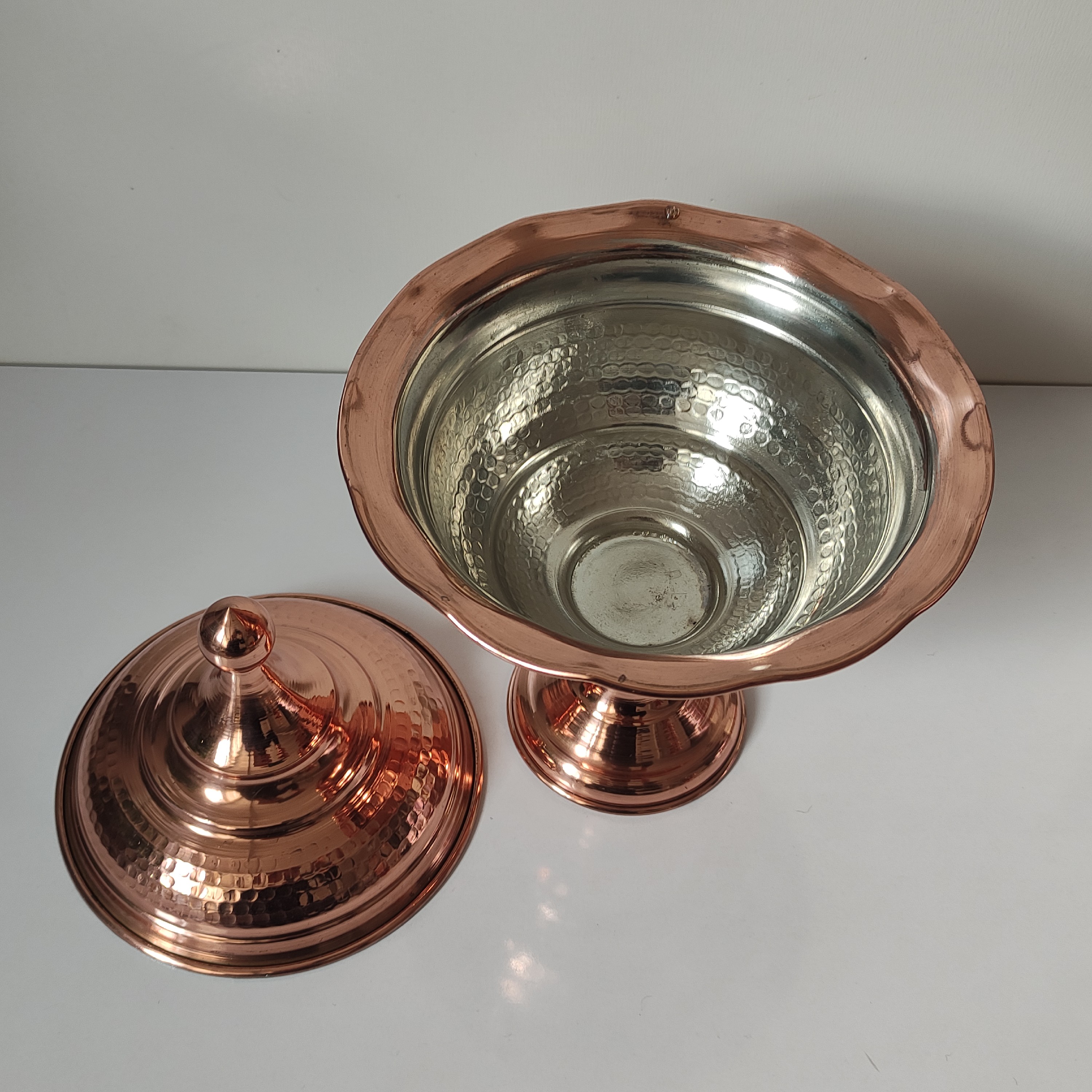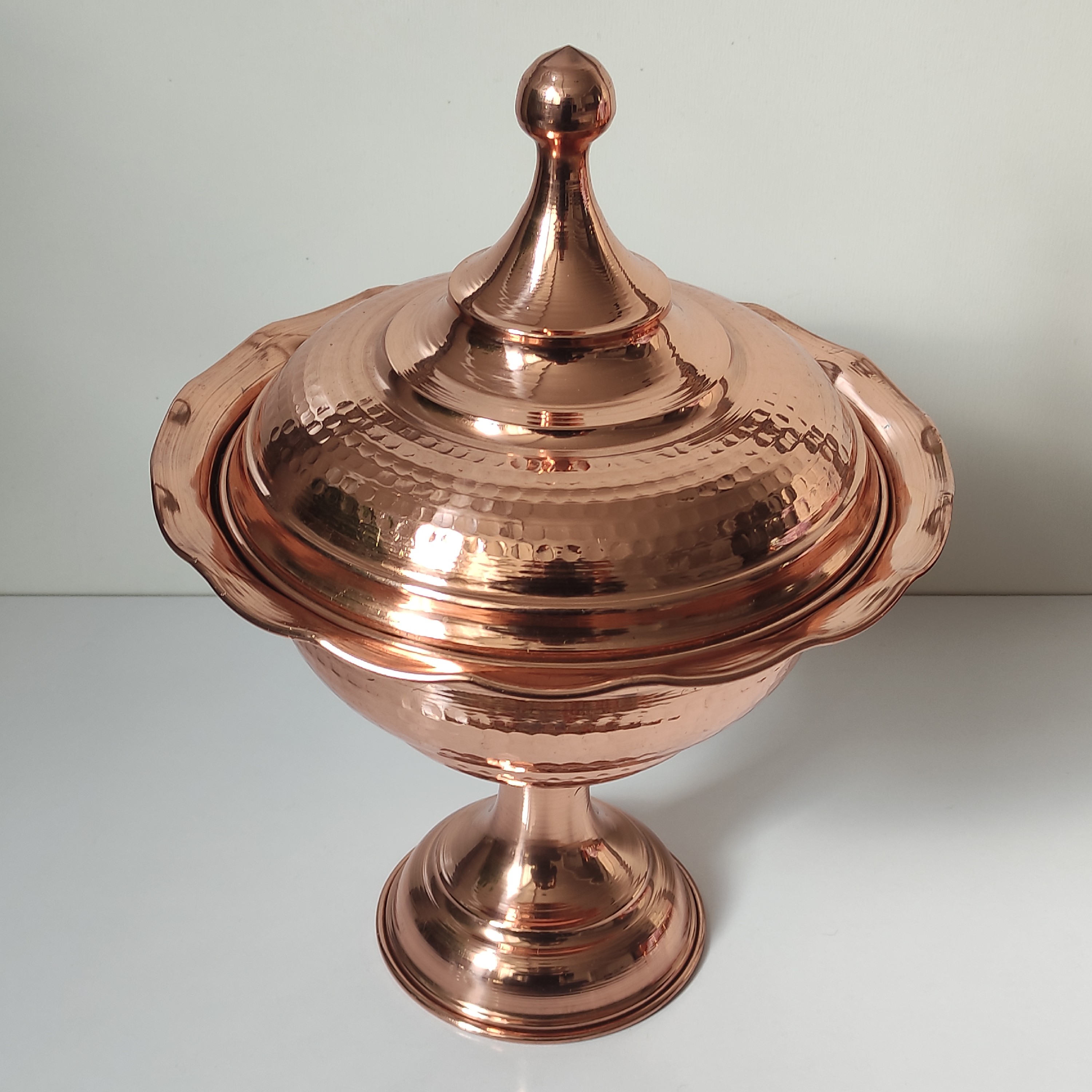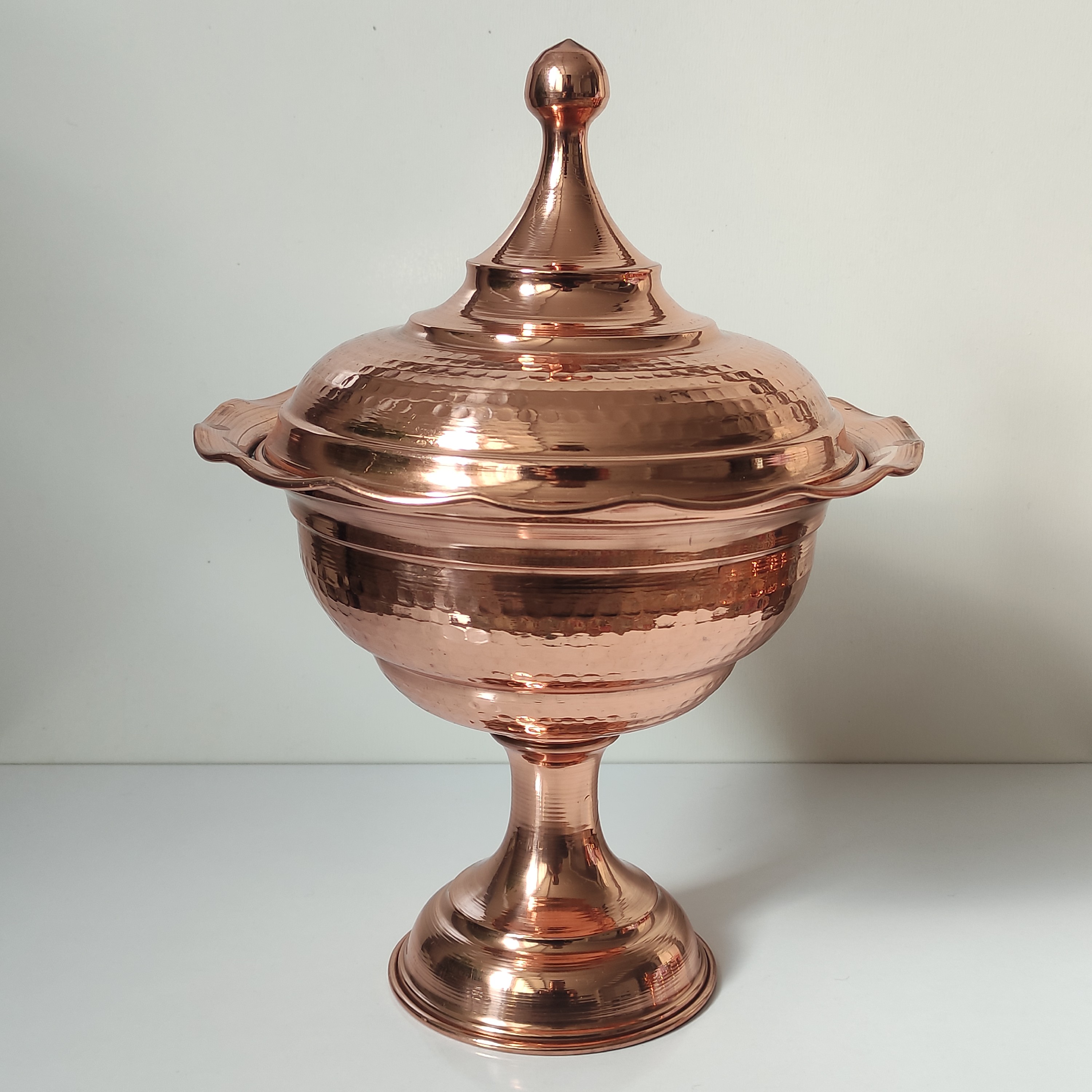 شکلات خوری دربدار مسی پذیرایی از مهمان یکی از موضوعاتی است که در فرهنگ ایرانی جایگاه ویژهای دارد. چای، میوه، شیرینی و شکلات و آجیل از مرسومترین اقلام پذیرایی در بین ما ایرانیان هستند. یک ظرف شکلات خوری مسی میتواند جلوهی زیبایی به میز پذیرایی خانهمان بدهد. ظرفی که به دست هنرمندان خلاق و باسلیقهی زنجانی ساختهشده و میتواند نظر علاقهمندان به هنرهای سنتی را به خود جلب کند. این محصول دارای پایه است که باعث بالاتر آمدن آن از سطح میز میشود. قسمت خارجی شکلات خوری به رنگ مسی است، داخل آن لعاب قلع دارد و نقرهای رنگ است. این ظرف زیبا می تواند به عنوان گز خوری، شکلات خوری و ... مورد استفاده قرار گیرد.
