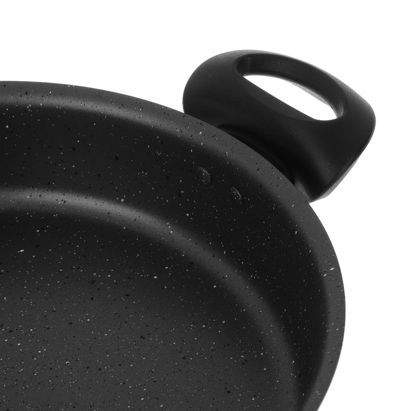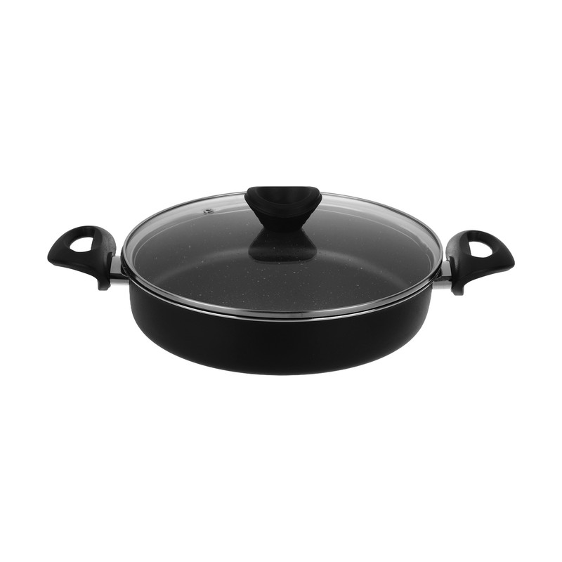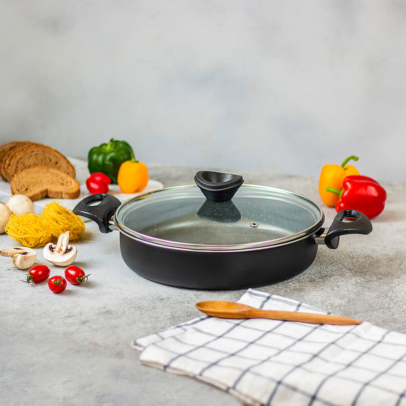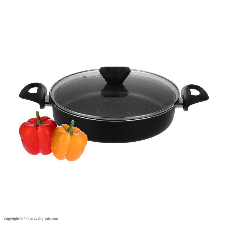تابه دو دسته مدل سایز 28، دارای پوشش درونی گرانیت نچسب و پوشش بیرونی رنگ پودری الکترواستاتیک است. بدنه داخلی این قابلمه خاکستری رنگ است و بدنه خارجی به صورت تک رنگ به رنگ مشکی است. این ظرف دارای ضخامت حدودا 2 میلیمتر است و انتقال حرارت بهصورت کاملا یکنواخت انجام میشود؛ درنتیجه مواد غذایی یکدست پخته میشوند. درپوش این تابه از جنس شیشه است که با رینگ استیل پوشیده شده و برای خروج بخار از ظروف یک سوپاپ ریز روی آنها تعبیه شده است. برای اینکه سطح داخلی ظروف شما برای مدتهای طولانی سالم و بدون خش بماند، تلاش کنید که همیشه از ابزارهای آشپزی مناسب برای این ظروف استفاده کنید.