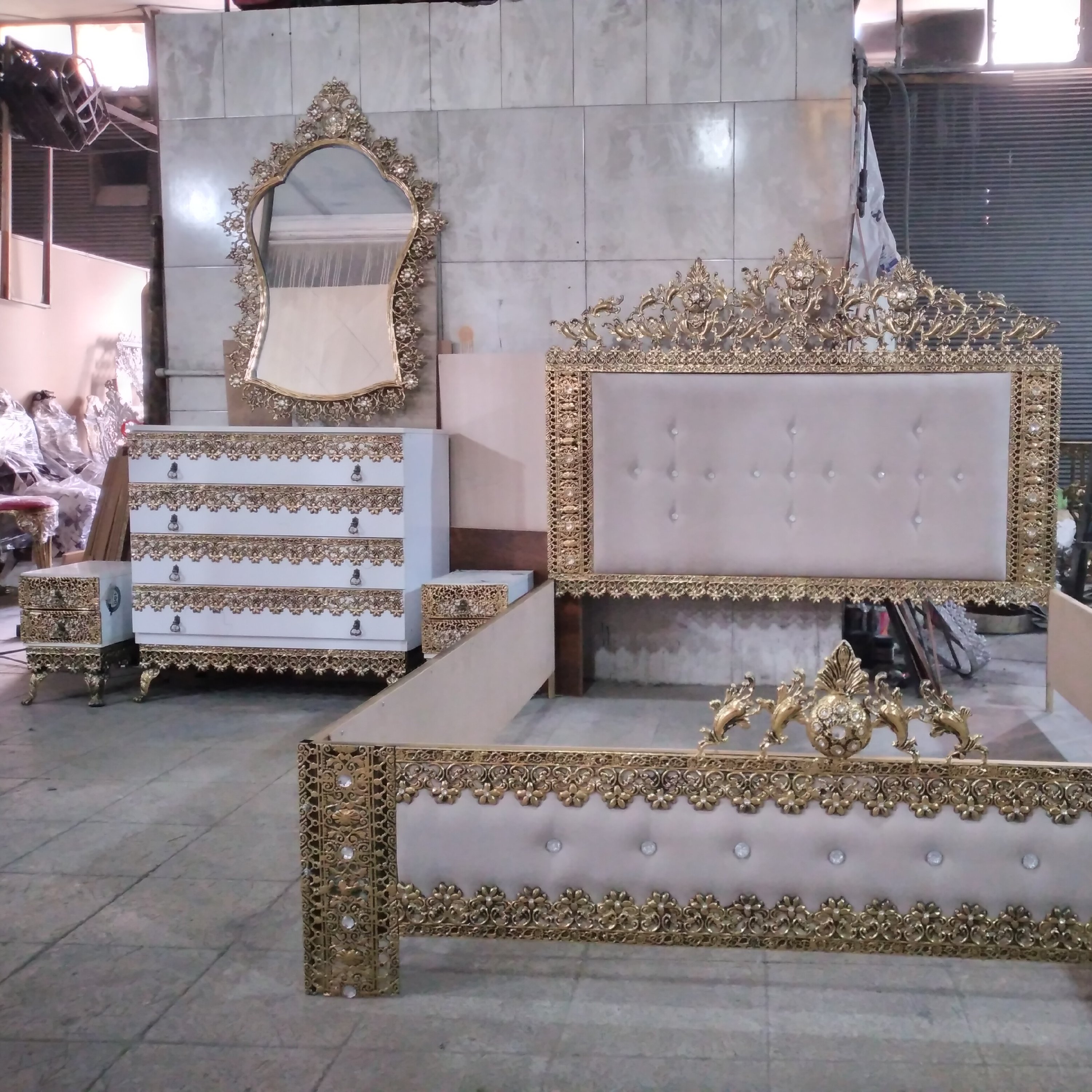 تولید سرویس خواب الیاژی این سرویس شامل یک عدد تخت دو نفره یک عدد میز ارایش با اینه و صندلی دو عدد پاتختی دو کشو می باشد پارچه به انتخاب مشتری ضمانت 10 ساله رنگ و روکوبی