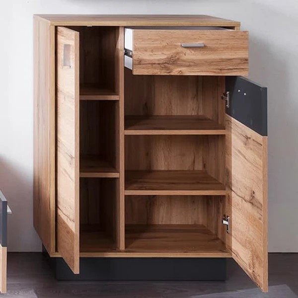 کتابخانه چند منظوره مدل IK370 جنس روکش از ملامینه میباشد و دارای دو درب با لولای آرام بند و یک کشو با ریل ساچمه ای با کیفیت و این کالا از استحکام و مقاومت بالایی برخوردار است و در رنگ بندی های زیبا و شکیل میباشد.