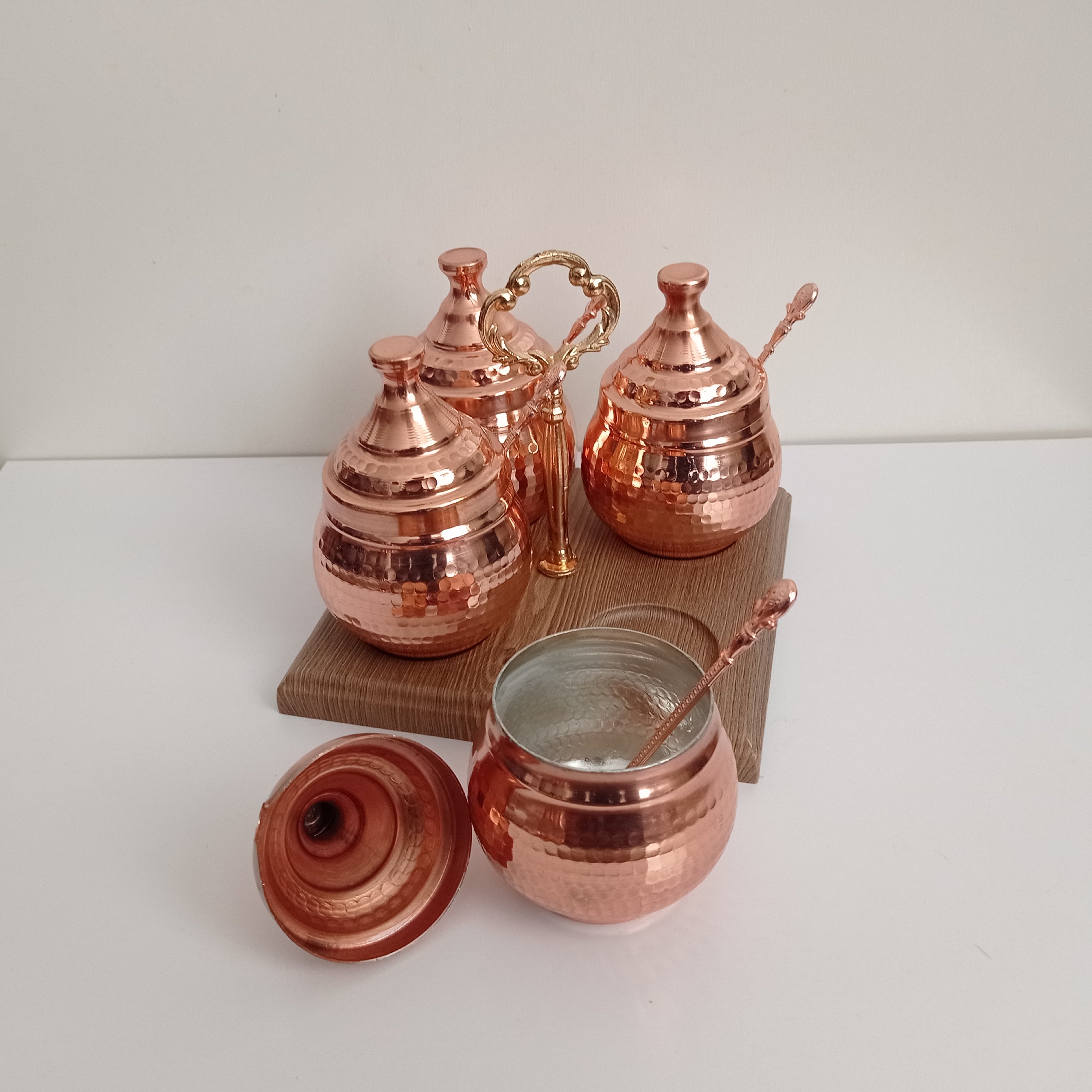 این ظرف مسی برای استفاده به عنوان جا ادویه و مربا خوری کاربرد دارد و نانو شده میباشد و دارای قاشق مسی و استند همراه دسته آویز میباشد. استند از جنس ام دی اف و دسته از جنس برنج میباشد.