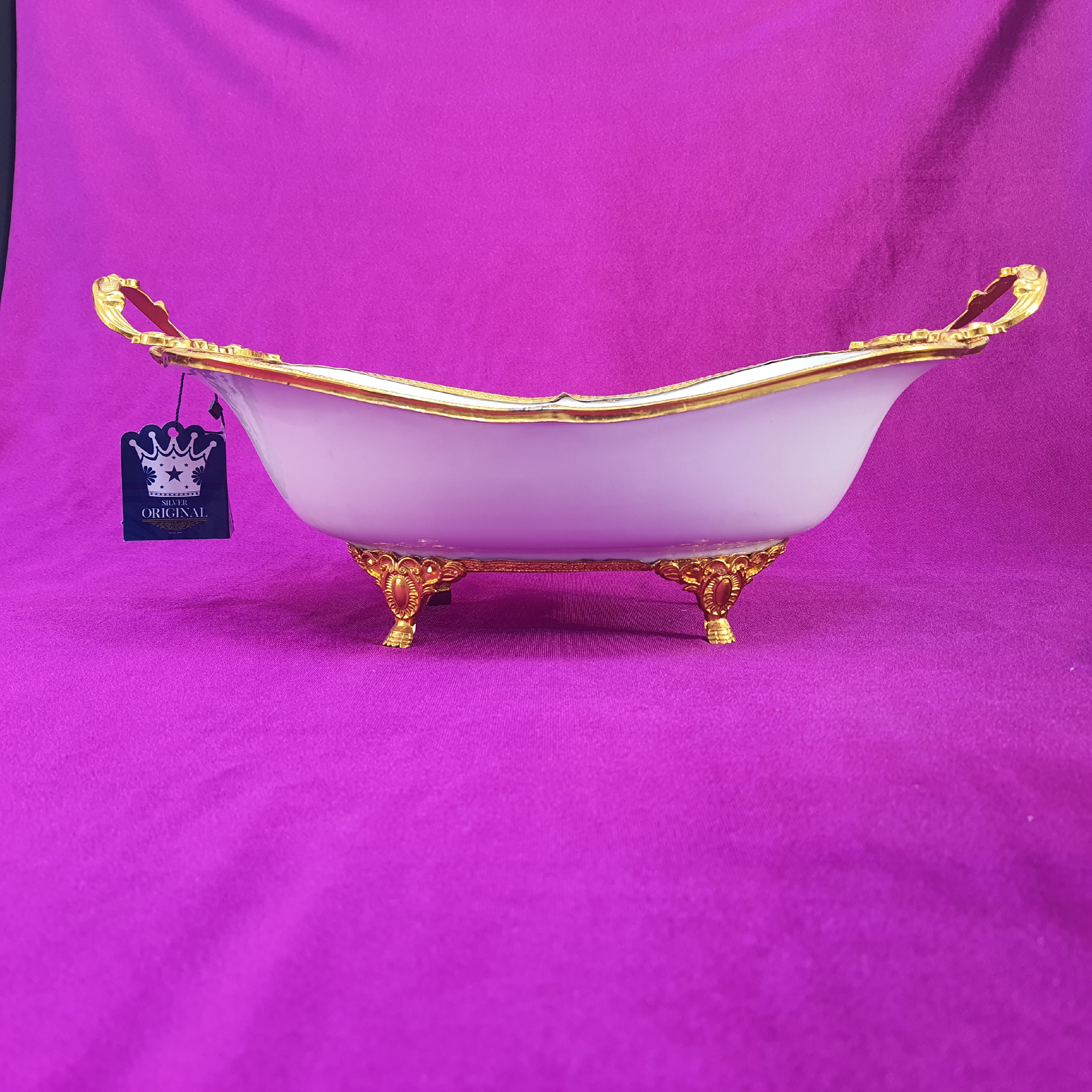 کاسه سرامیک دور طلایی G383 ظروف سرامیکی با زیبایی و طراحی موزون خود، در اولین نگاه نظر هر بیننده ای را جلب می نماید. قطعات فوق العاده ظریف این پیکره به نحوی طراحی شده اند که از هر جهت پاسخگوی نیازهای مصرف کنندگان باشند. مناسب برای جهیزیه و پذیرایی دور این دیس با فلز زاماک طلاکاری شده و داری رنگ ثابتی می باشد 4 عدد پایه در زیر این ظرف قرار گرفته که زیبایی دو چندانی برای این سینی به ارمغان اورده است ابعاد کاسه سرامیک دور طلایی G383 عرض محصول 23 سانت طول محصول 40 سانت طول محصول با دسته 45 سانت ارتفاع محصول از پایه 13 سانت عمق تقریبی محصول 7 سانت