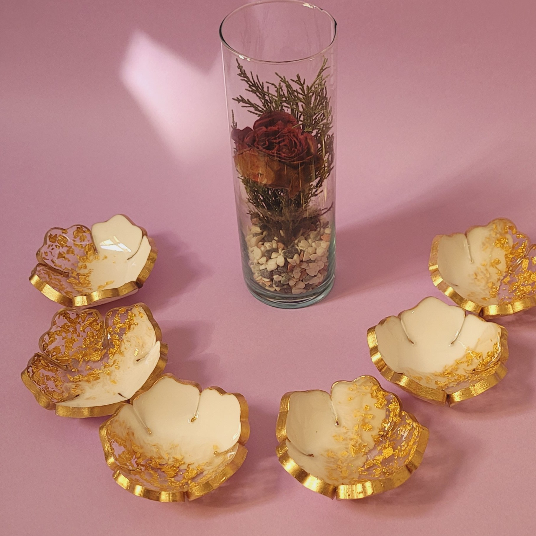 6تا پیاله قطر 13 سانت به همراه اینه قطر 20سانت . تمامی پیاله ها از رزین ساخته شدن و قابل شستشو هستن. اینه با سنگ ژئود کار شده و تمامی کارها بادست ساخته شدن. آینه بدون پایه هست.