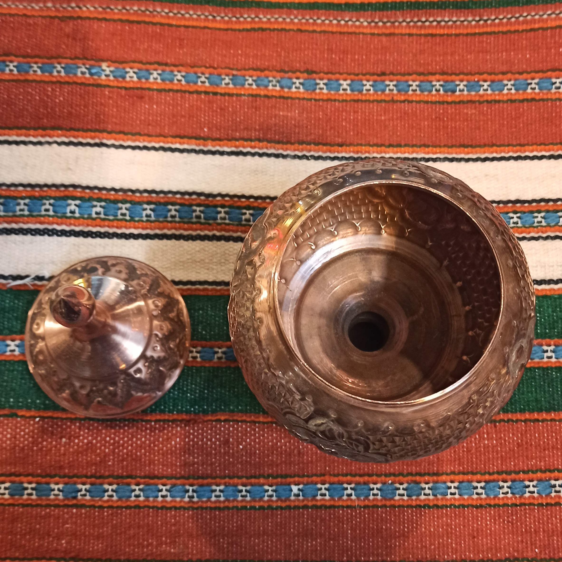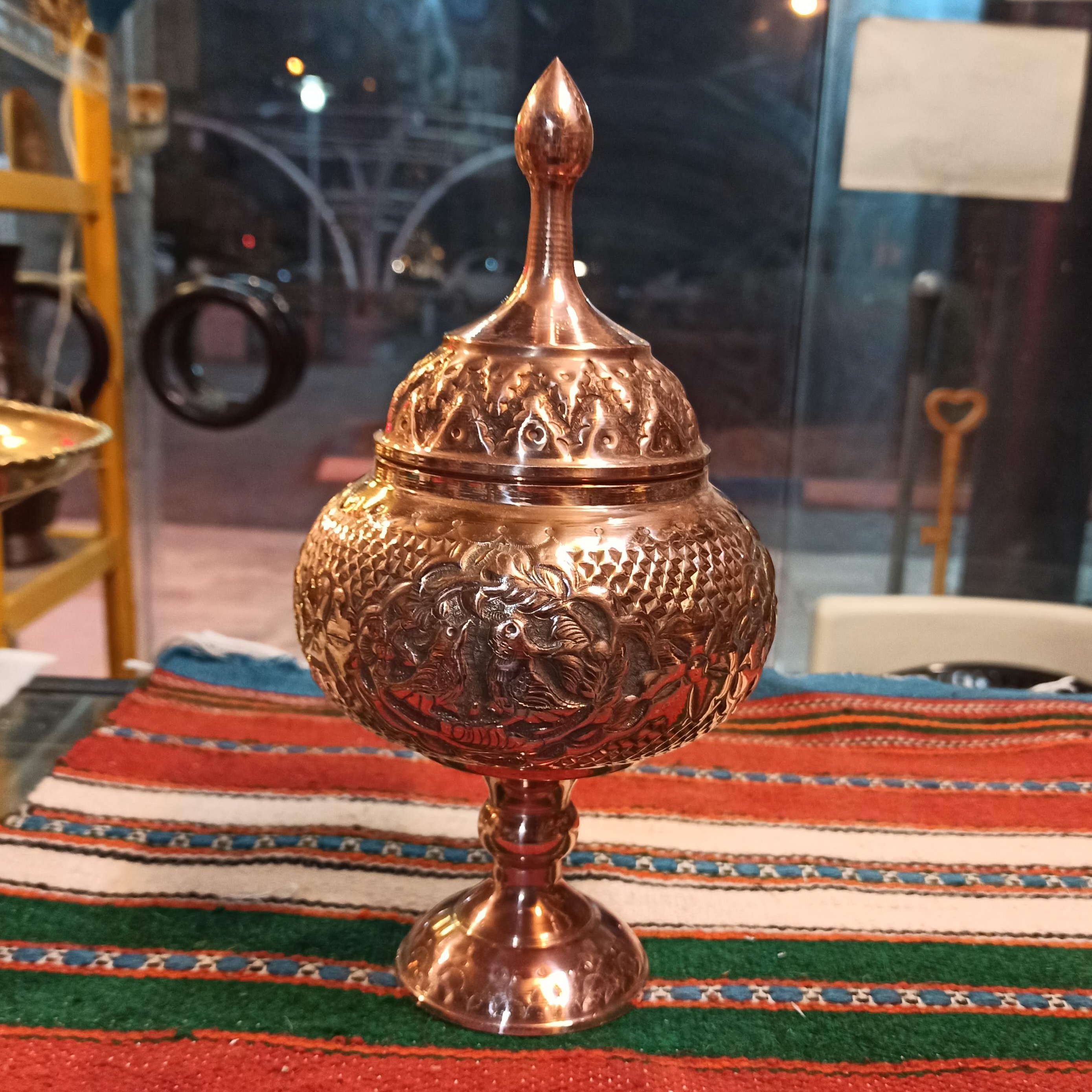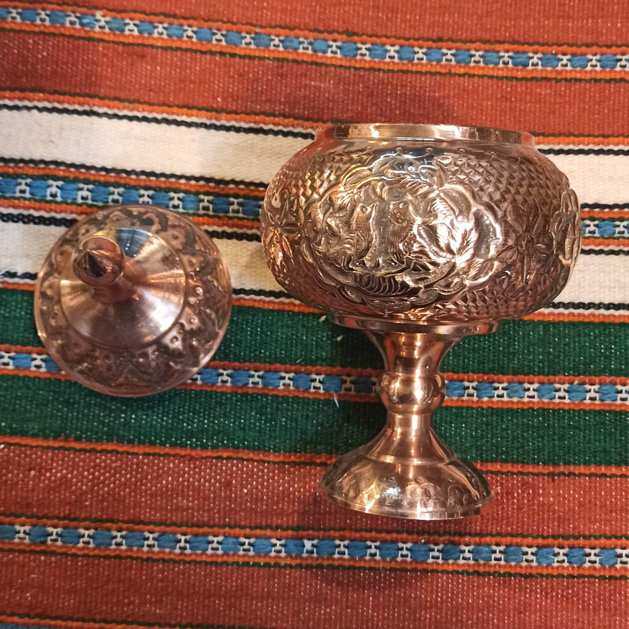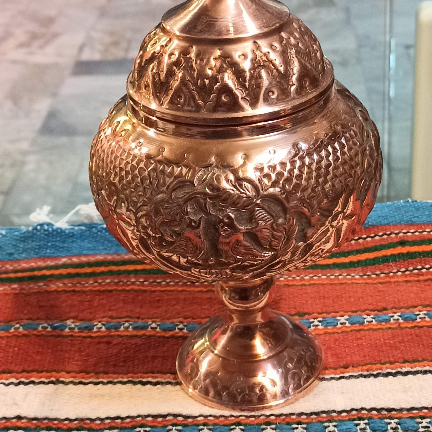 قندان،شکلات خوری پایه دار مسی، قلم دست،پر کار، به ارتفاع بیست و شش سانت، هنر دست هنرمندان ایرانی