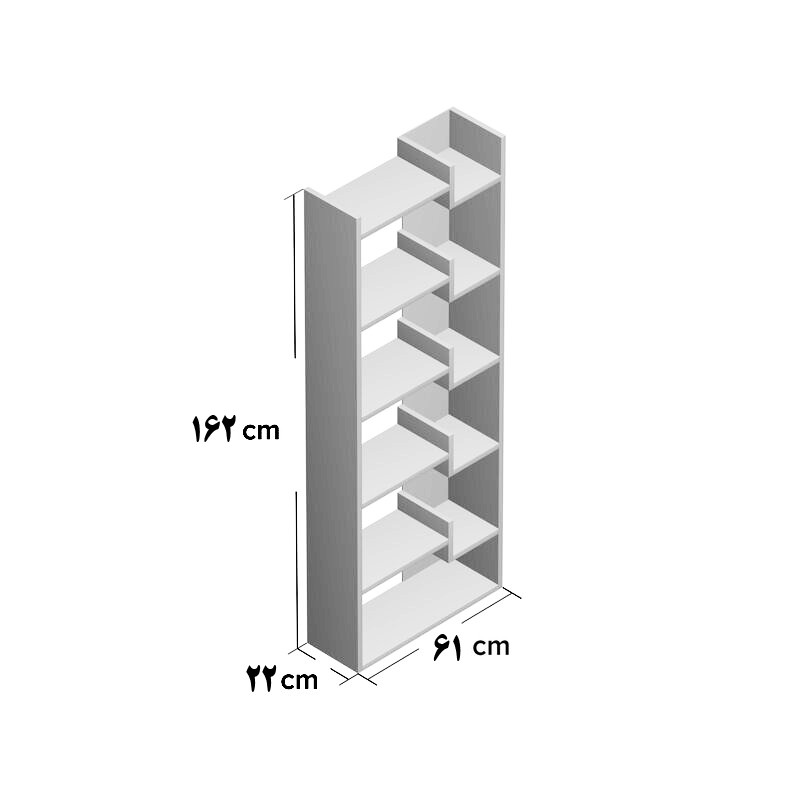 کتابخانه قدی با ارتفاع 162سانتیمتر با طبقه بندی مناسب برای انواع کتابها از جنس لترون درجه یک قابلیت قرارگیری 100تا 150جلد کتاب را دارد. این کتابخانه را می توان در پذیرایی، در اتاق خواب، روی دیوار و یا حتی به عنوان ویترین و جاعروسکی نیز استفاده کرد. اطلاعات دقیق ابعادی در بین تصاویر محصول وجود دارد.