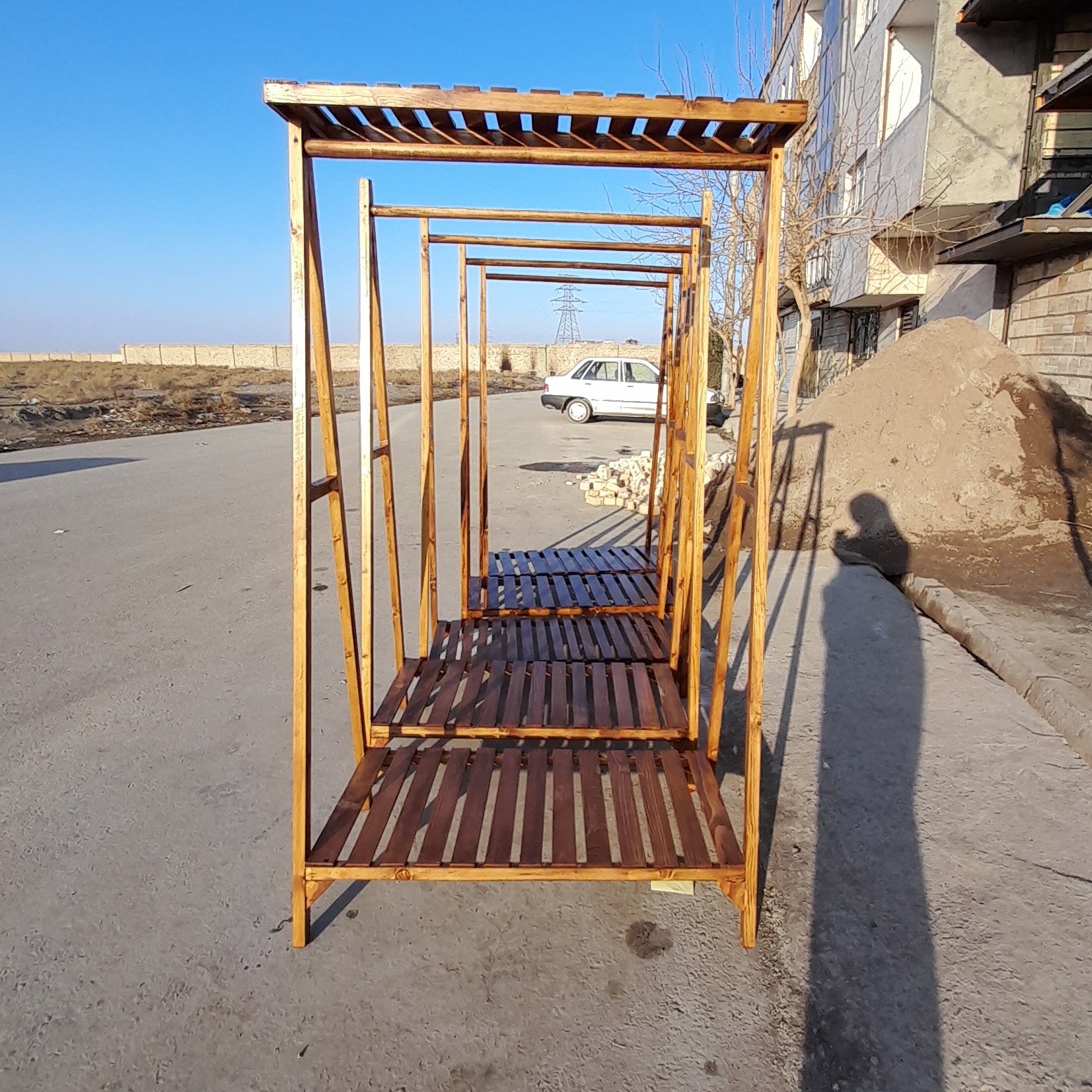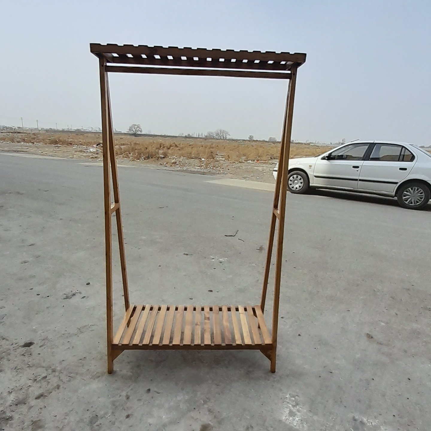 رگال لباس مدل تاجدار یک طبقه ابعاد این نمونه رگال به طول 100 سانتی متر در ارتفاع 175سانتی متر میباشد همراه با 6 عدد چوب لباسی تماما چوب درجه یک قابليت جداسازی برای حمل آسان تحمل بالای وزن استفاده شده از بهترین رنگ و جلا در بازار