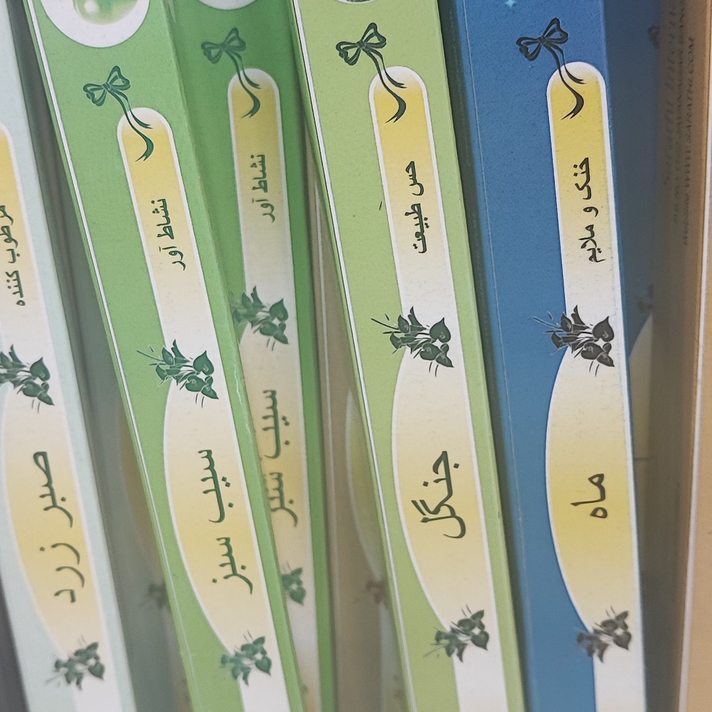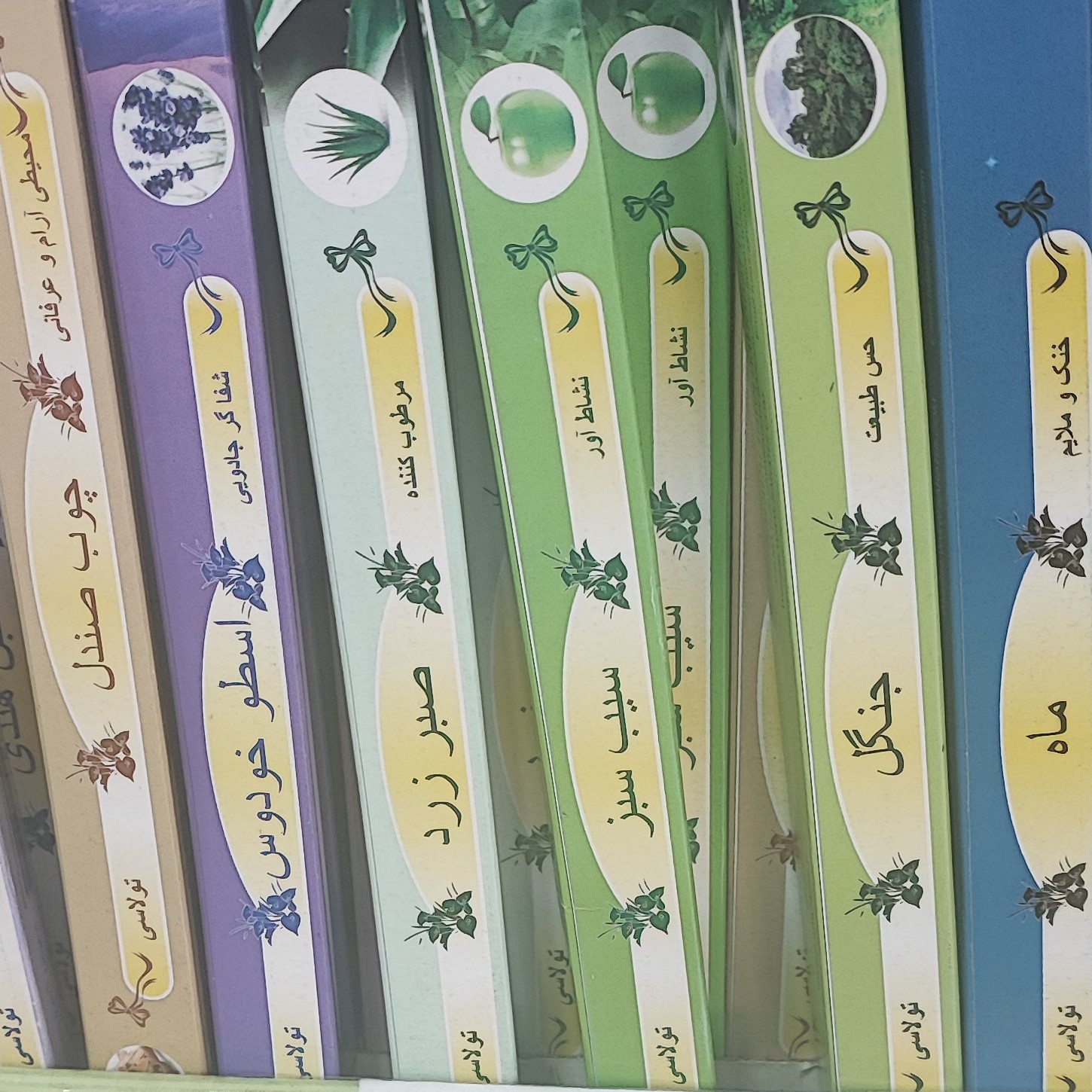 رنگ زرد رایحه چای سبز رنگ قرمز رایحه الهه گلها رنگ قهوه ای رایحه دارچین رنگ سبز رایحه ماه رنگ آبی رایحه جنگل رنگ بنفش رایحه قهوه رنگ سرمه ای رایحه سیب سبز رنگ سفید رایحه صبر زرد رنگ مشکی رایحه گل یاس رنگ طلایی رایحه اسطوخودوس رنگ لیمویی رایحه چوب صندل رنگ نباتی رایحه سنبل هندی
