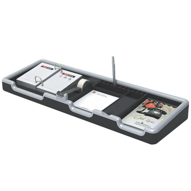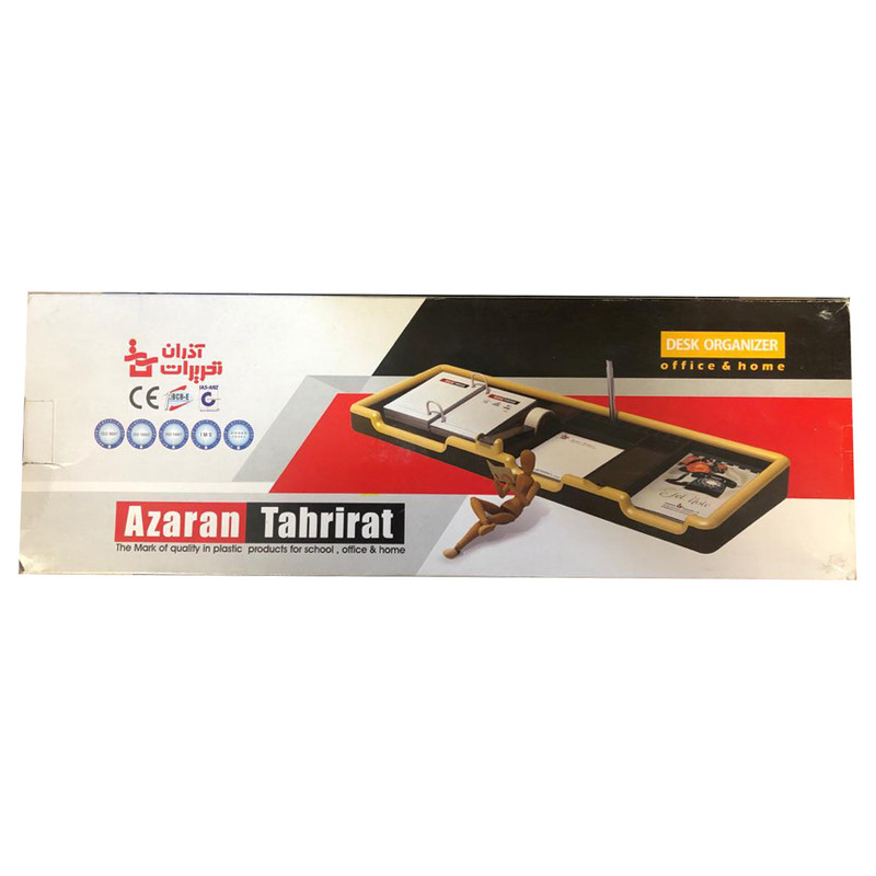 ست رومیزی یکپارچه و کارآمد آذران مدل ۳۶۲ جهت جمع و جور کردن و نظم بخشیدن به نوشت افزار روی میز کارتان که می توانید طبق نیاز از خانه های به هم پیوسته و جادار این ارگانایزر اداری رومیزی استفاده نمایید. شرکت محصولی به نام ست لوازم اداری رومیزی کد ۳۶۲ را جهت استفاده بر روی انواع میز اداری کوچک و شلوغ که امکان گم شدن وسایل رومیزی زیاد است، طراحی و تولید نموده است. این ست یکپارچه دارای جای تقویم رومیزی، جای چسب نواری ۲ سانت، جای کاغذ یادداشت، جایی جهت قرار دادن سوزن ته گرد یا پونز، خانه ای دیگر برای نگهداری گیره کاغذ یا کلیپس کاغذ، محلی جهت گذاشتن یک دفتر تلفن یا دفترچه یادداشت کوچک، قسمتی درب دار که امکان قرار دادن مهر یا اشیاء مهم که می خواهیم در جلوی دید همگان نباشد و ۱۱ عدد حفره جهت گذاشتن انواع خودکار یا مداد می باشد. ست رومیزی اداری پلاستیکی آذران با ابعاد ۱۷٫۵ × ۵۲ سانتی متر و وزن ۴۰۰ گرم در دو رنگ مشکی و کرم به ل پیوستگی تمامی اقلام مصرفی لوازم اداری فضای کمی را روی میز اشغال کرده و در زمان نیاز به هر وسیله ای به راحتی می توانید آن را یافته و به سرعت به کار خود ادامه دهید.