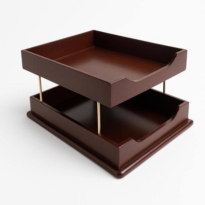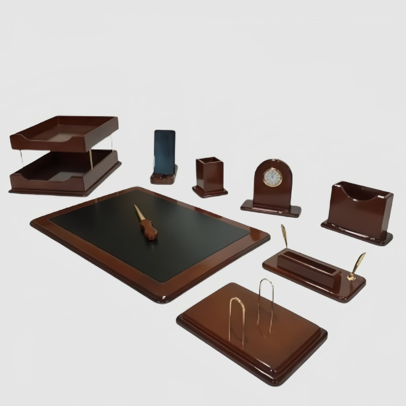 ساختهشده از چوب با روکش براق و قطعات فلزی طلایی رنگ، این ست علاوه بر زیبایی، نظم و سازماندهی میز کار را بهبود میبخشد و مناسب محیطهای اداری، مدیریتی و هدیههای رسمی است.