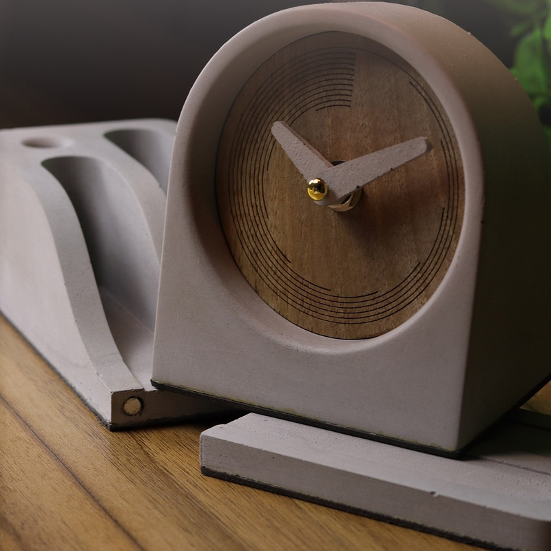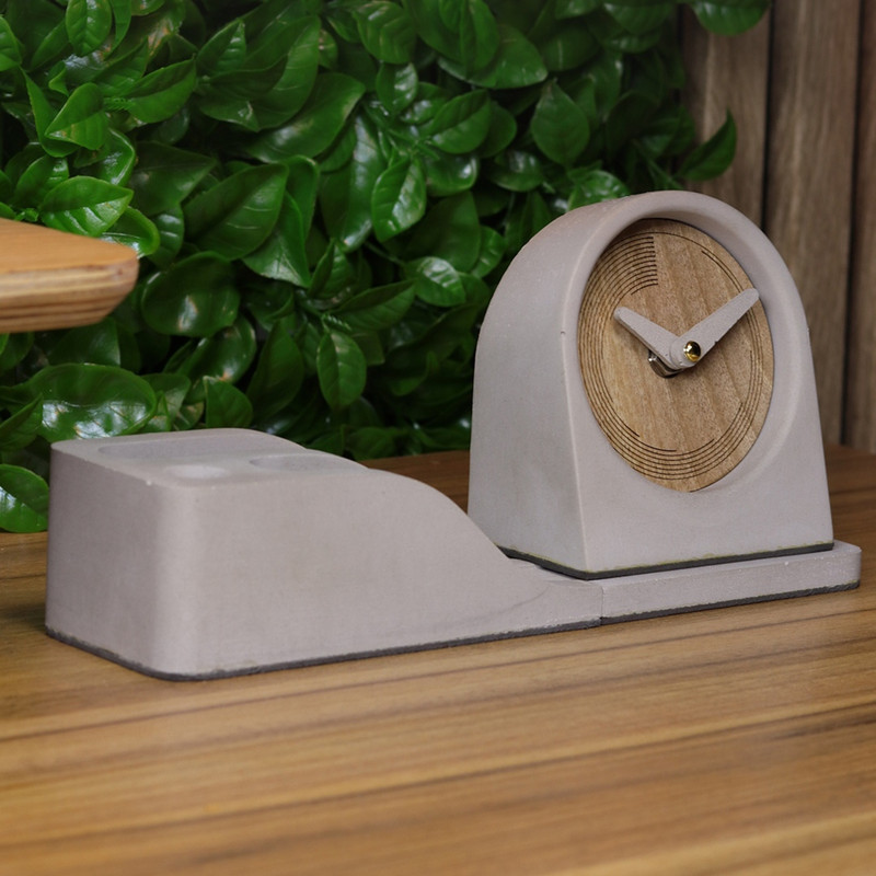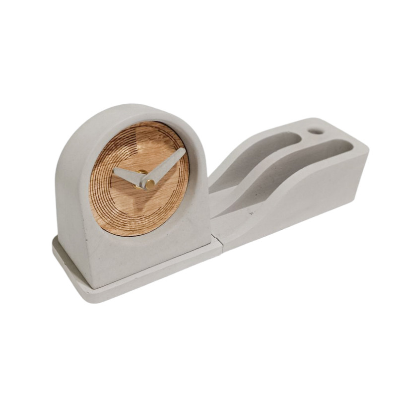 ، یک نیمست رومیزی از جنس بتن با طراحی مینیمال و کاربردی است که شامل محل نگهداری موبایل، کاغذ یادداشت، قلم و ساعت رومیزی میشود که جنس پنل ساعت از چوب طبیعی گردو بوده و عقربه های آن نیز از بتن مخصوص با دقت و ظرافت خاصی ساخته شده است. در دو رنگ طوسی و سفید با امکان شخصیسازی مانند حک لوگو و اسم سازمان انتخابی شایسته برای هدایای تبلیغاتی و استفاده در دفاتر کاری حرفهای است. مقاوم، زیبا و متفاوت؛ هر آنچه برای یک میز منظم و متمایز نیاز دارید، در خلاصه شده است.