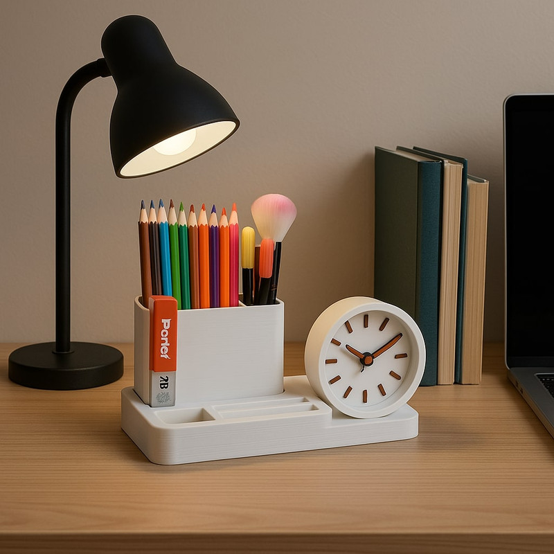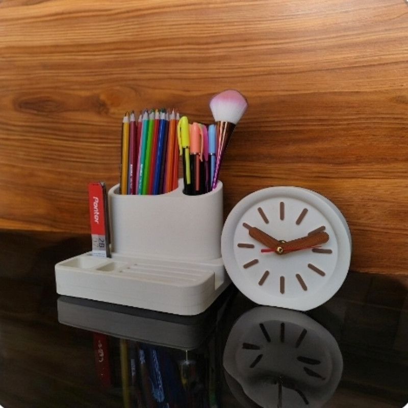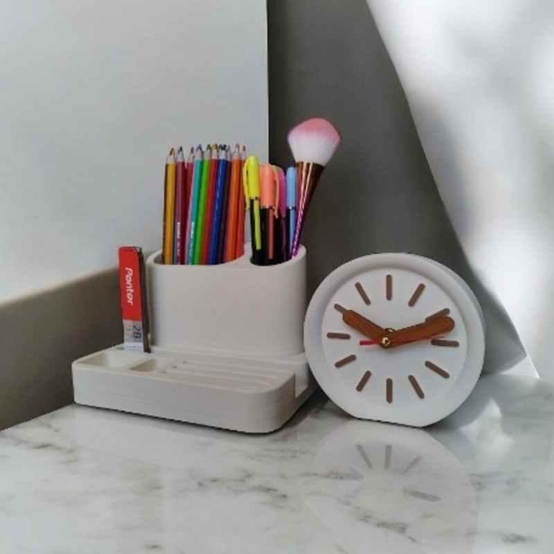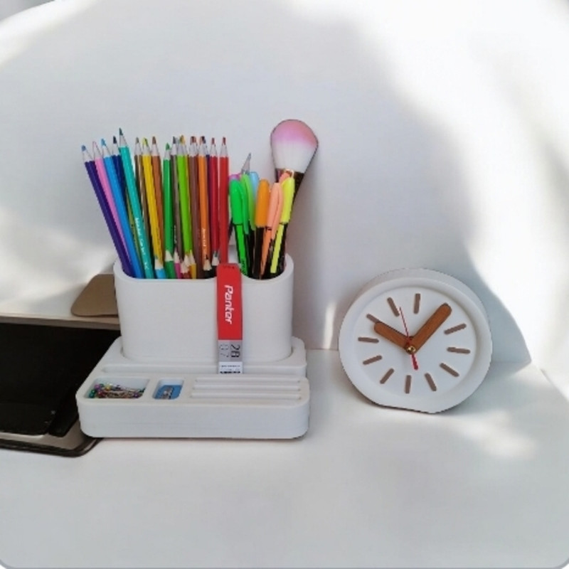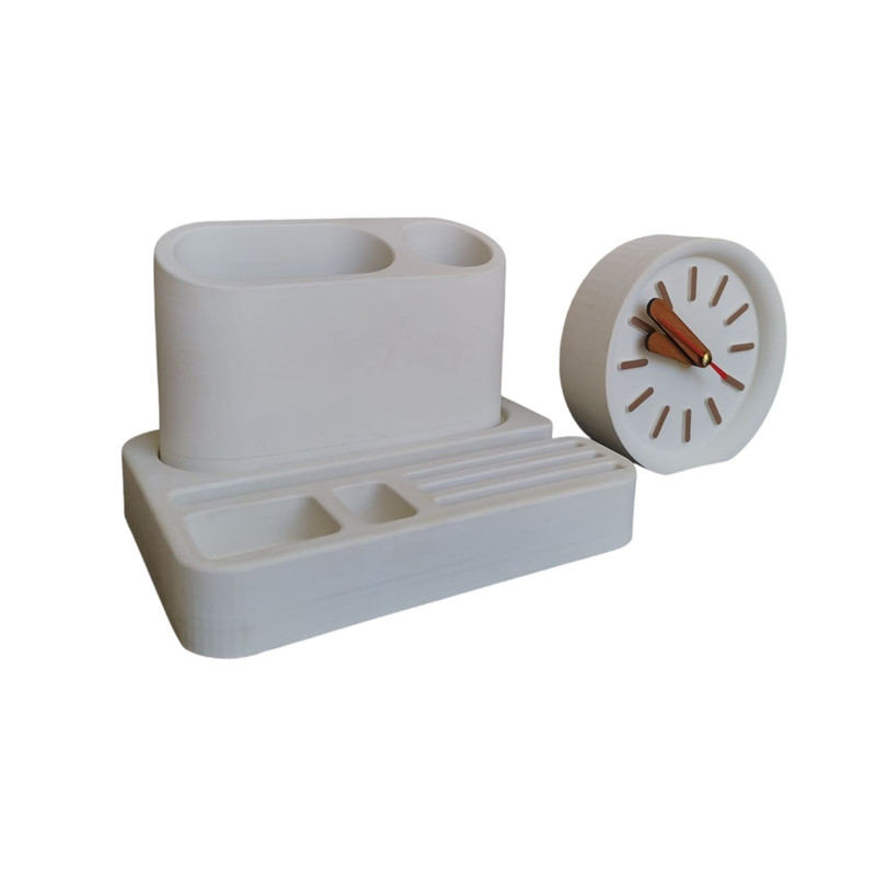 محصولی که در تصویر مشاهده میکنید یک ست اداری رومیزی چندکاره با طراحی مینیمال و مدرن است که از جنس بتن پلیمری ساخته شده و این متریال علاوه بر مقاومت بالا، ظاهری خاص و زیبا به محصول بخشیده که بهراحتی با دکورهای مدرن و مینیمال هماهنگ میشود. این ست شامل یک نظمدهنده کاربردی با ابعاد تقریبی ۱۵ در ۵.۵ سانتیمتر و ارتفاع ۹.۳ سانتیمتر است که بخشهای مختلفی برای نگهداری خودکار، مداد رنگی، براش، ماژیک، پاککن، تراش و سایر لوازمالتحریر دارد؛ روی یک کفی با طول ۱۸ و عرض ۱۳ سانتیمتر قرار گرفته که به محصول استحکام و زیبایی دوچندان میبخشد. همچنین یک ساعت رومیزی با طراحی ساده اما خاص و قطر حدود ۱۲ سانتیمتر و عرض ۳ سانتیمتر بخشی از این مجموعه است که با عقربههای چوبی خود جلوهای گرم و هنری به میز کار یا مطالعه شما میدهد. این ست برای دانشآموزان، دانشجویان، طراحان و تمام افرادی که به نظم و زیبایی میز کار اهمیت میدهند، یک انتخاب کاربردی و شیک محسوب میشود. تجهیزات ساعت مانند موتور و عقربهها بهمنظور جلوگیری از آسیب، به صورت جداگانه و سمپلنشده خدمتتان ارسال میگردد.