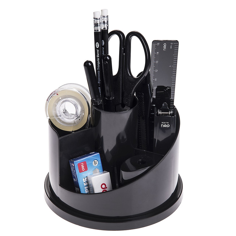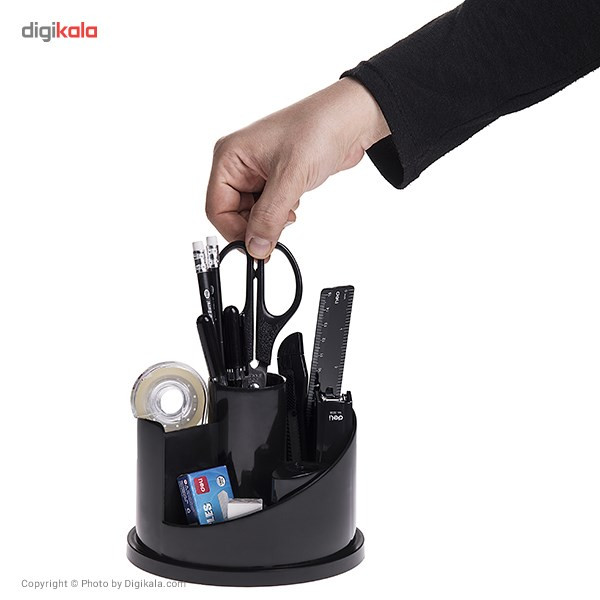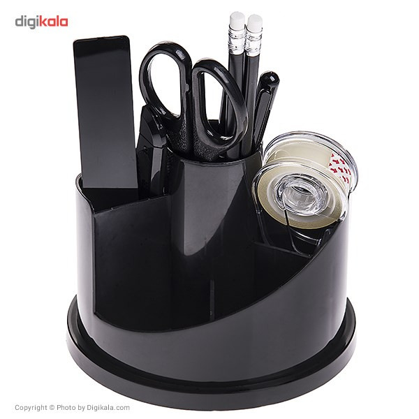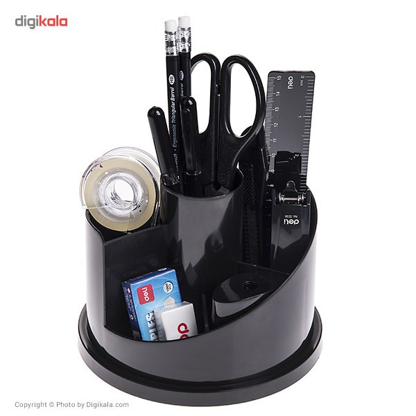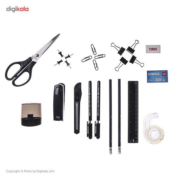 - بههمراه یک منگنه، یک بسته سوزن منگنه شماره ۱۰، دو مداد مشکی پاککندار، دو خودکار مشکی، یک تراش، یک پاککن، یک خطکش، ۴ گیره کاغذ کلیپسی، ۲۰ عدد گیره کاغذ ساده، ۱۰ عدد سوزن نقشه، یک پایهی چسب به همراه چسب، یک کاتر و یک قیچی - با پایهی گردان