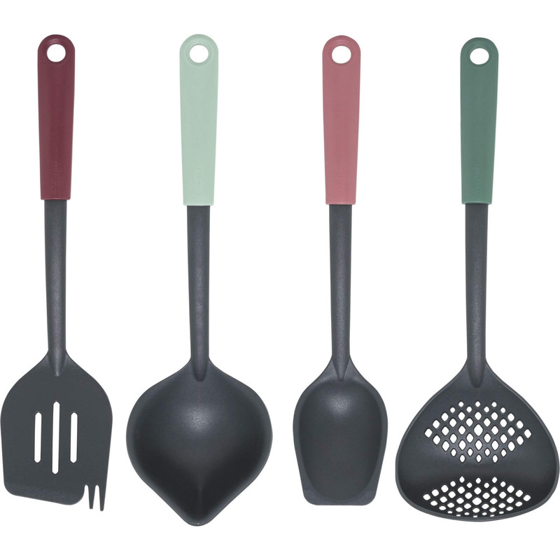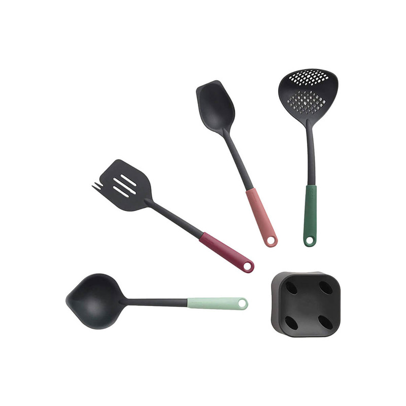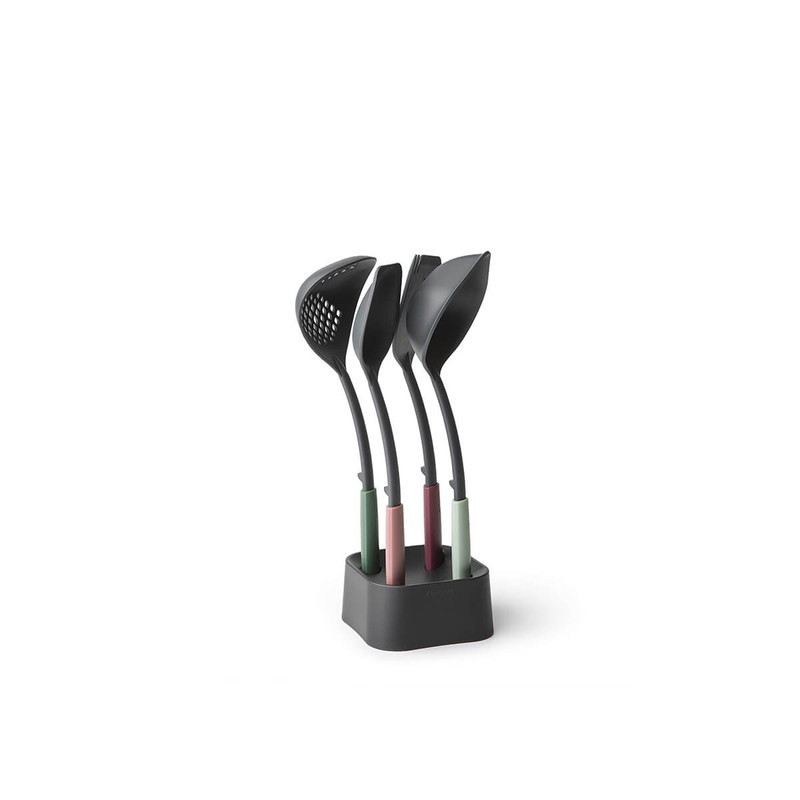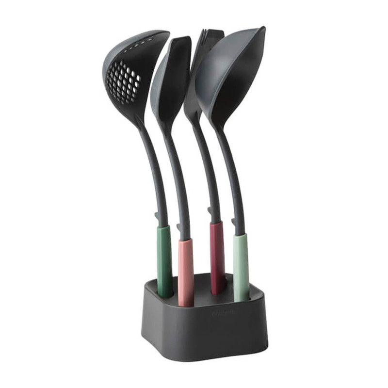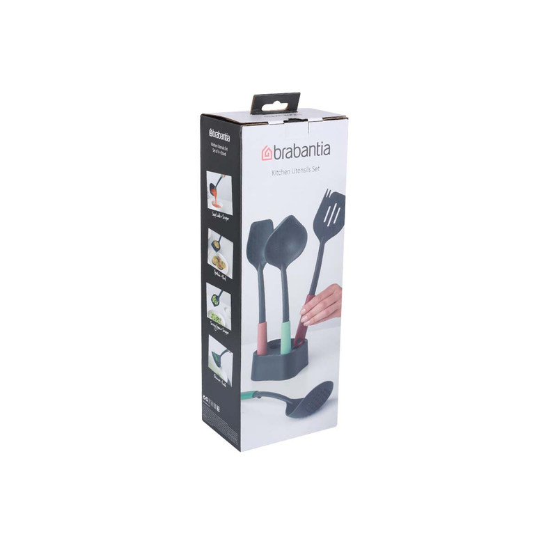ست ابزار آشپزی 5 پارچه برابانتیا مدل BRABANTIA Tasty مجموعه ای هوشمند از پایه و 4 مورد ضروری آشپزخانه با ارتفاع 33 سانتی متر است . ملاقه سوپ به اضافه ابزار خراش دهنده ، قاشق سرو به همراه کفگیر است . طراحی ارگونومیک که رویه هایی با لبه های گوشه دار یا گرد برای رسیدن به هر گوشه است . قابل شستشو در ماشین ظرفشویی و مقاوم در برابر حرارت تا حداکثر 220 درجه سانتیگ .