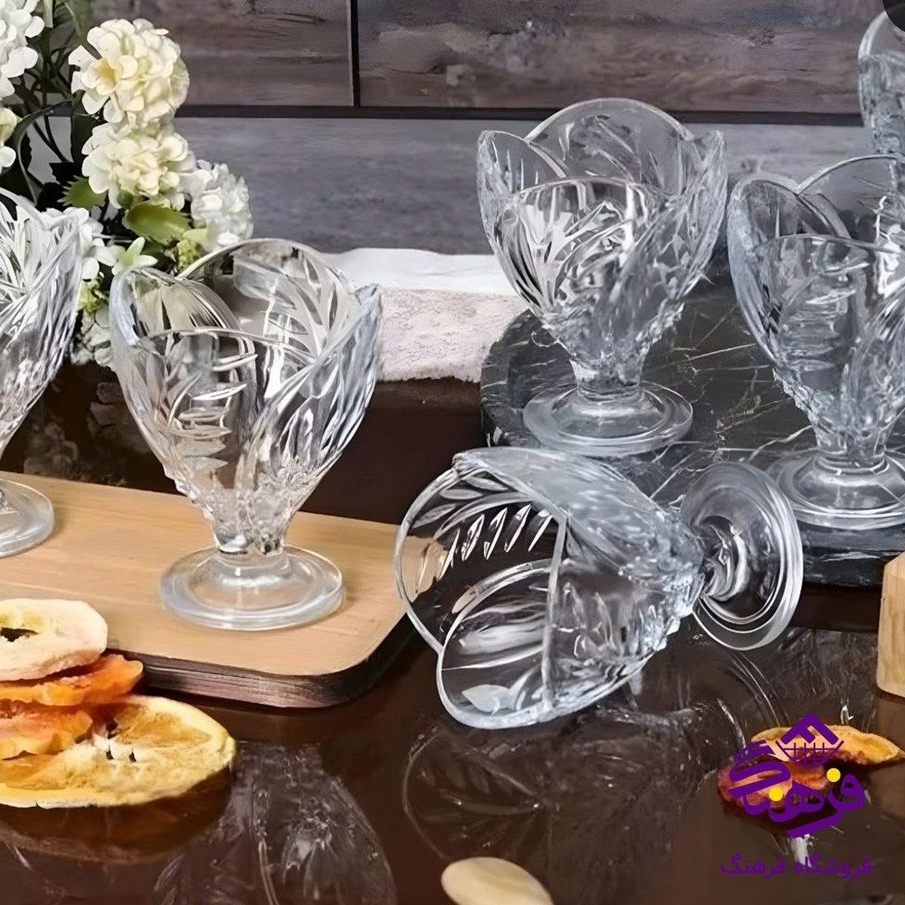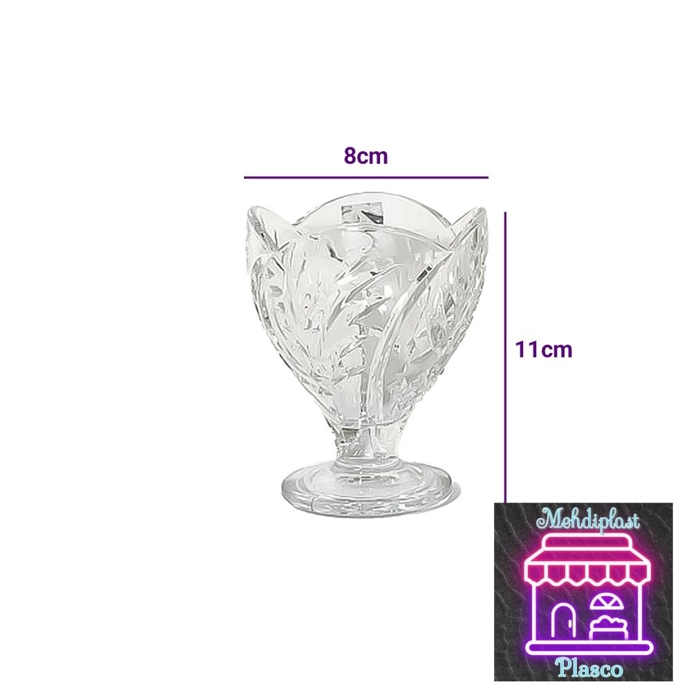 محصول بلور اصفهان. کاملا شفاف و طراحی شیک و بهروز، هر بسته شامل 6عدد میباشد.مناسب سرو انواع بستنی،ژله،انواع دسر ها و حتی انار