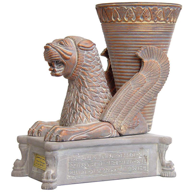 ریتون، نام باستانی ساغر یا جام است که ایرانیان آنها را با شکلی خاص و مهارتی تمام میساختند. این جامها معمولا به شکل ظروفی ساخته میشدند که انتهایشان به شکل سر حیواناتی مانند شیر، ببر، گوزن، آهو، اسب، گاونر، بز وحشی و... با اندازه های متفاوت بوده است. ایرانیان در عهد کهن ریتونها را به شکل کله جانوران قویبنیه میساختند و براین باور بودند با نوشیدن از این جامها زور و قوه جانور به آنها منتقل میشود.ارتفاع این تندیس در حدود 22 سانتیمتر، وزن آن کمتر از 3 گرم و جنس آن از پلیاستر است. کارگاه «تندیس و پیکرهسازی شهریار» این تندیس را با الهام از ریتونهای دوره هخامنشی ساخته است.