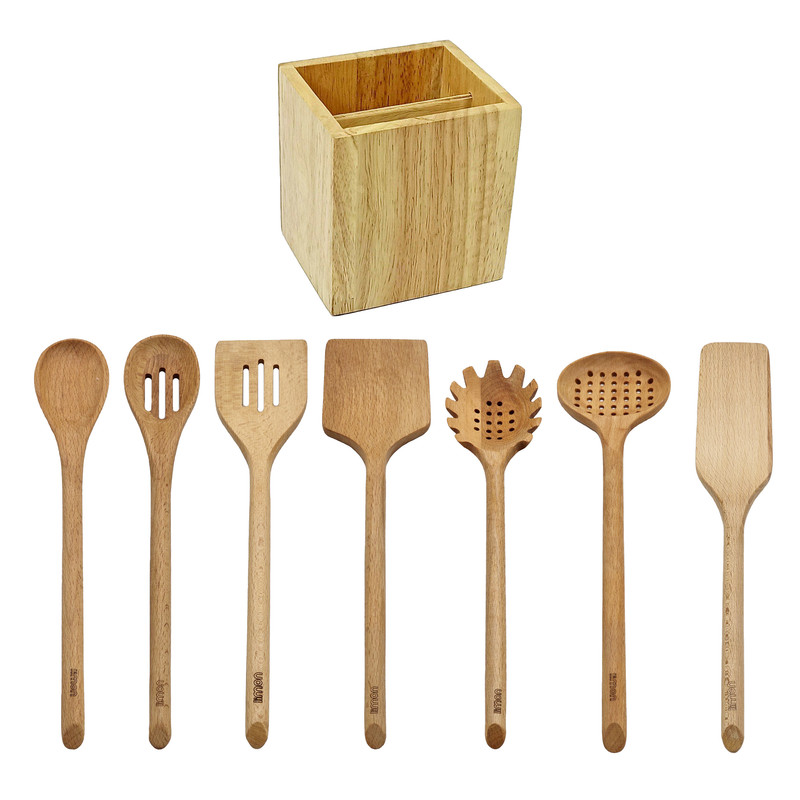 بهترین کف گیر و ملاقه های موجود در بازار کف گیر و ملاقه های چوبی هستند چون نه مثل مواد پلاستیکی دارای مواد سرطانی و سمی بوده و هم زیبایی و سادگی بسیار زیادی دارند. این مدل از کف گیر ملاقه های چوبی ساخت شرکت بوده و برند هم در صنعت خانه و آشپزخانه پیشتاز و بهترین هست. شما با خرید این ست 8 تیکه ( 7 عدد کف گیر و ملاقه به اضافه استند نگهدارنده) شما تمامی ابزار لازم برای آشپزی را خواهید داشت.
