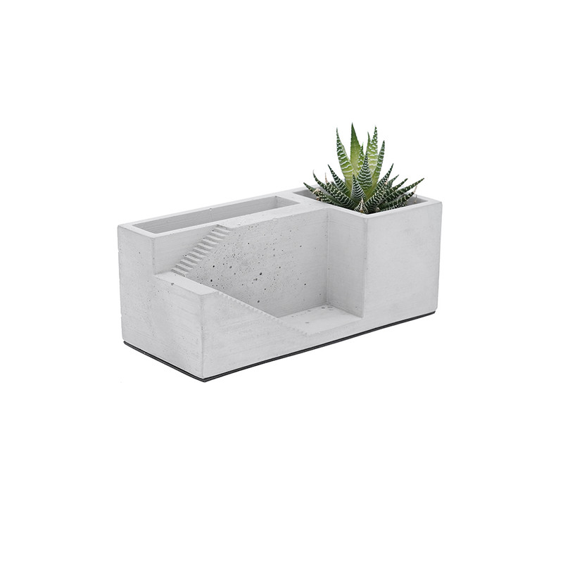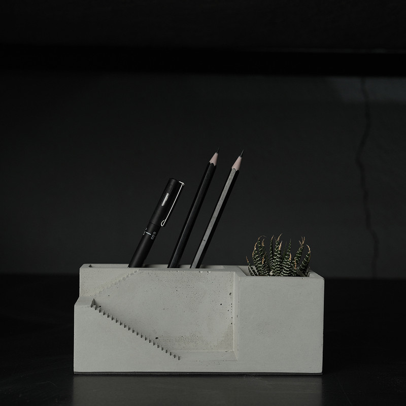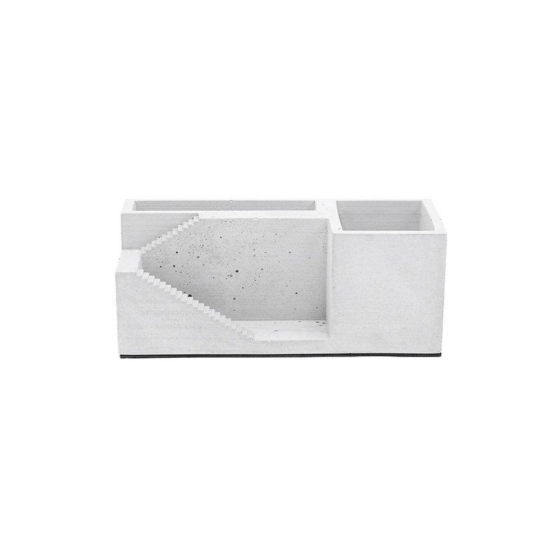 نیم ست رو میزی بتنی استودیو پله به گونه ای طراحی شده است که گلدان، جای کارت ویزیت و نگه دارنده گوشی موبایل و همچنین جاقلمی، یکجا و کنار هم قرار گرفته شوند.