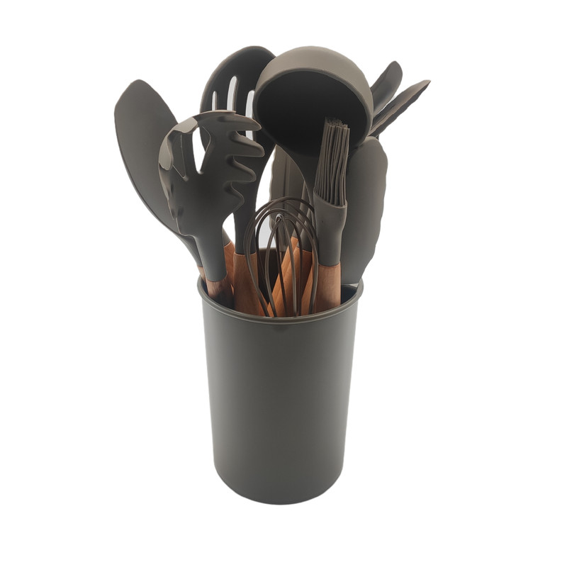 سرویس کفگیر Kitchen Set ساخته شده از با کیفیت ترین مواد سیلیکون با استاندارد FDA و بدون BPM ، دسته های چوبی از جنس بامبو و یک ظرف نگهدارنده از جنس پلاستیک میباشد. این سرویس از وزن متعادل و دیزاین منحصر بفردی برخوردار است که باعث میشود در دست گرفتن آن آسان و پخت و پز را راحت می کند. سیلیکون به کار رفته در این محصول ساخته شده از مواد غیر سمی ، بی بو و سازگار با محیط زیست است. این مجموعه وسایل آشپز خانه در برابر درجه حرارت سرما تا 30- و گرما 230+ درجه سانتی گ مقاومت دارد.