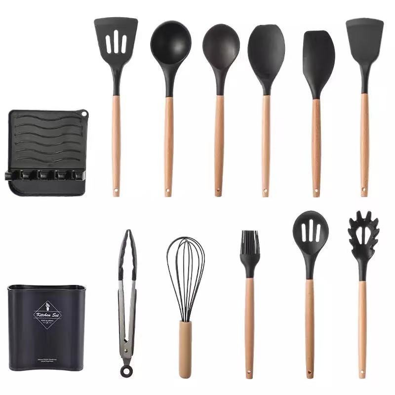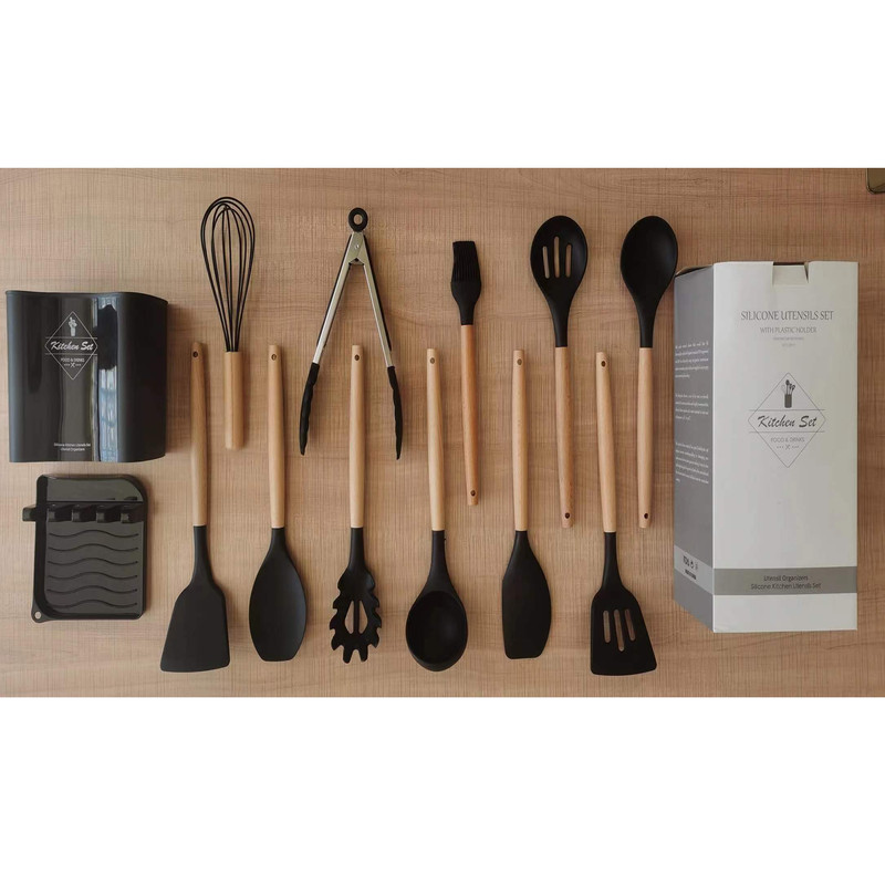 سرویس کفگیر Kitchen Set ساخته شده از با کیفیت ترین مواد سیلیکون با استاندارد FDA و بدون BPM ، دسته های چوبی از جنس بامبو و یک ظرف نگهدارنده از جنس پلاستیک میباشد. این سرویس از وزن متعادل و دیزاین منحصر بفردی برخوردار است که باعث میشود در دست گرفتن آن آسان و پخت و پز را راحت می کند. سیلیکون به کار رفته در این محصول ساخته شده از مواد غیر سمی ، بی بو و سازگار با محیط زیست است. این مجموعه وسایل آشپز خانه در برابر درجه حرارت سرما تا 30- و گرما 230+ درجه سانتی گ مقاومت دارد. انعطاف پذیری ، رویه های نرم از خراشیدن و آسیب رساندن به ظروف شما جلوگیری میکند و همچنین باعث کاهش سر و صدا هنگام آشپزی می شود. این مجموعه متشکل از 11 عدد کفگیر ملاقه و یک عدد استند قاشق و درب قابلمه و یک عدد ظرف نگهداره می باشد.
