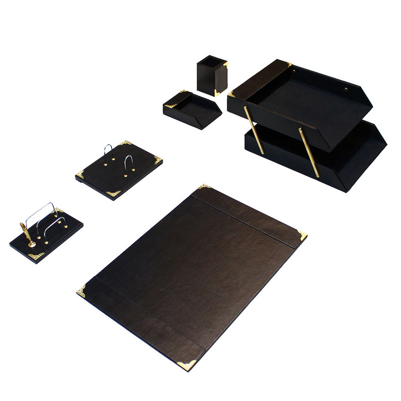 ست رومیزی اداری شامل:کازیه 2 طبقه با پایه های برنجیجاتقویمیاستند کارت و پاکت نامه و روان نویس جامدادی لیوانی کلاف چوبی از جنس ام دی اف مرغوب با روکش چرم درجه یک و پایه ها و اتصالات برنجی هدیه ی روی ست یک عدد پایه چسب می باشد.