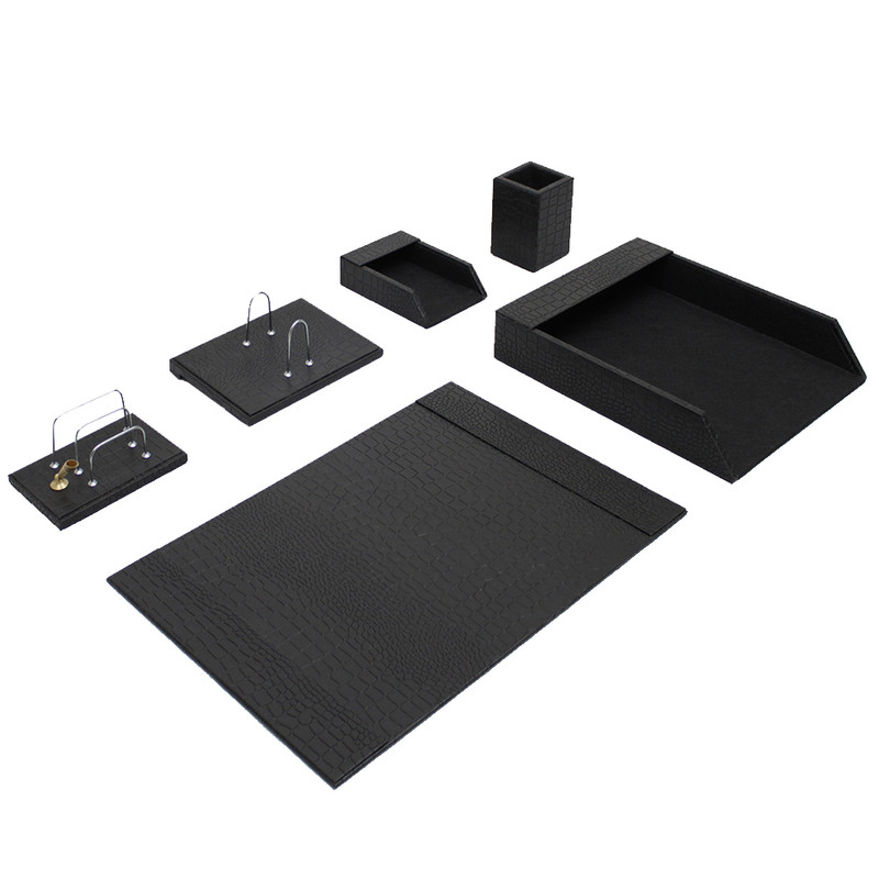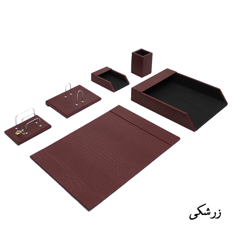 ست رومیزی لوازم اداری چرمی پوست ماری شامل زیر دستی، کازیه، جای کاغذ یادداشت، پایه تقویم، استند پاکت نامه، جاکارتی، استند روان نویس و جا قلمی لیوانی است