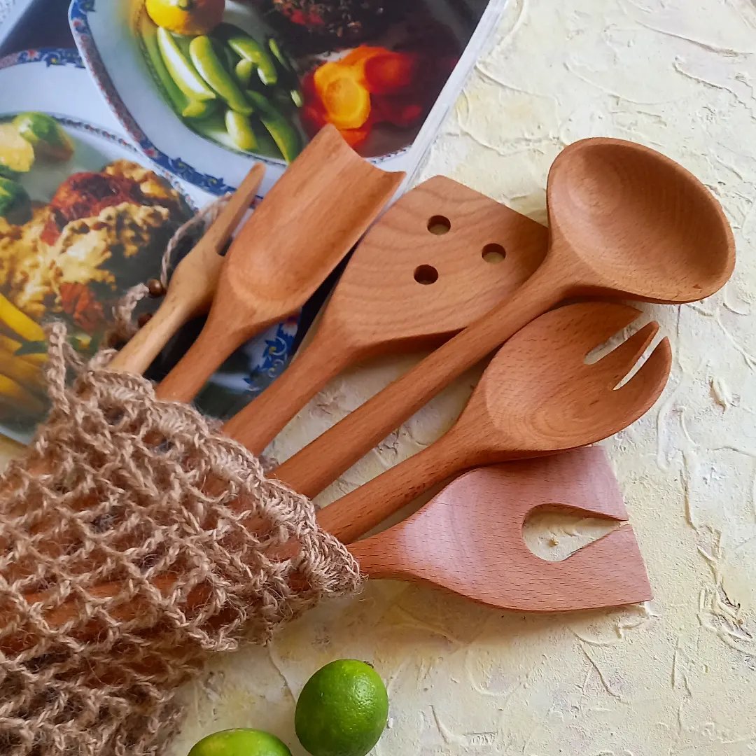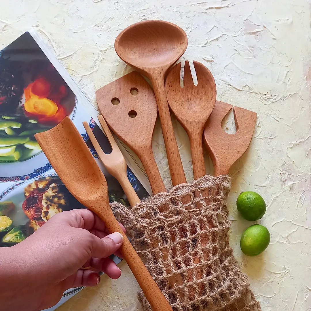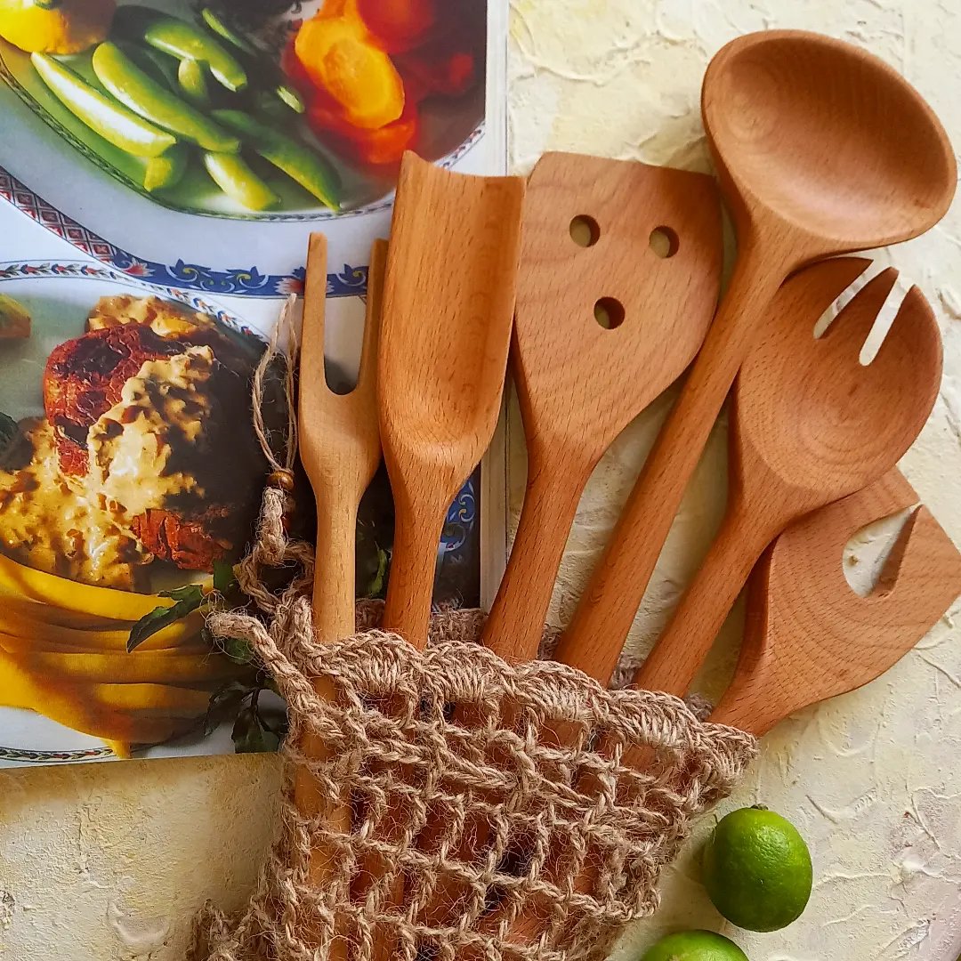 سرویس قاشق چوبی دستساز بارلی ویژه جهیزیه عروس کاوردار 6 تکه چوب راش 25 سانتی کد bar0030 مبلمونسرا مدل 277351