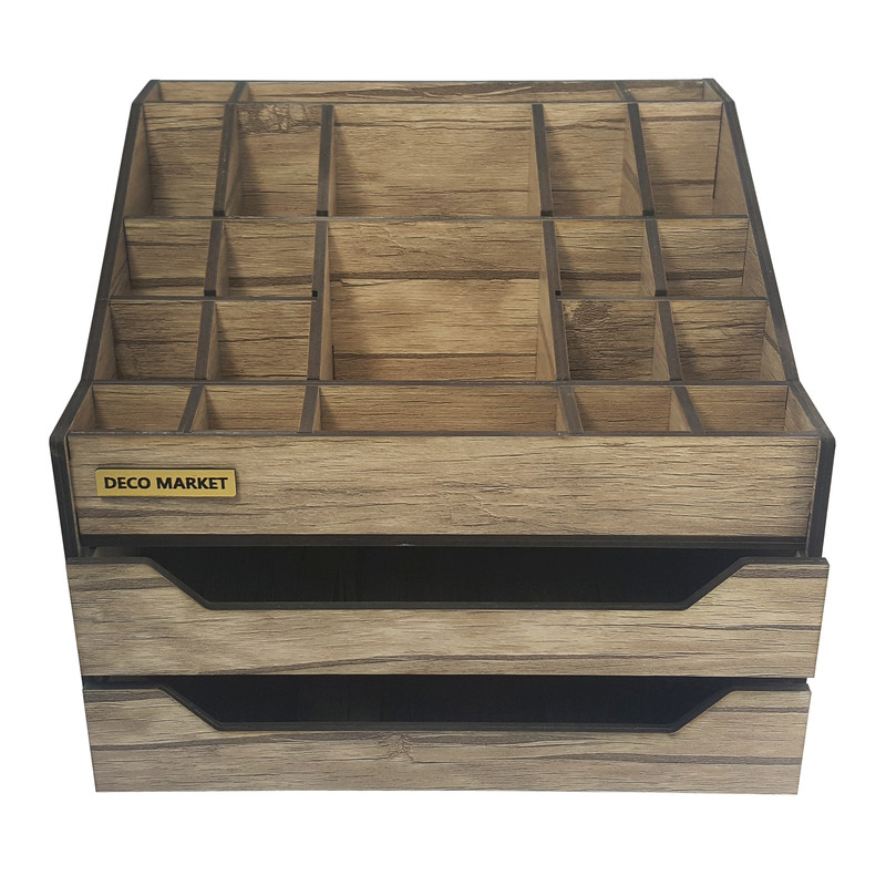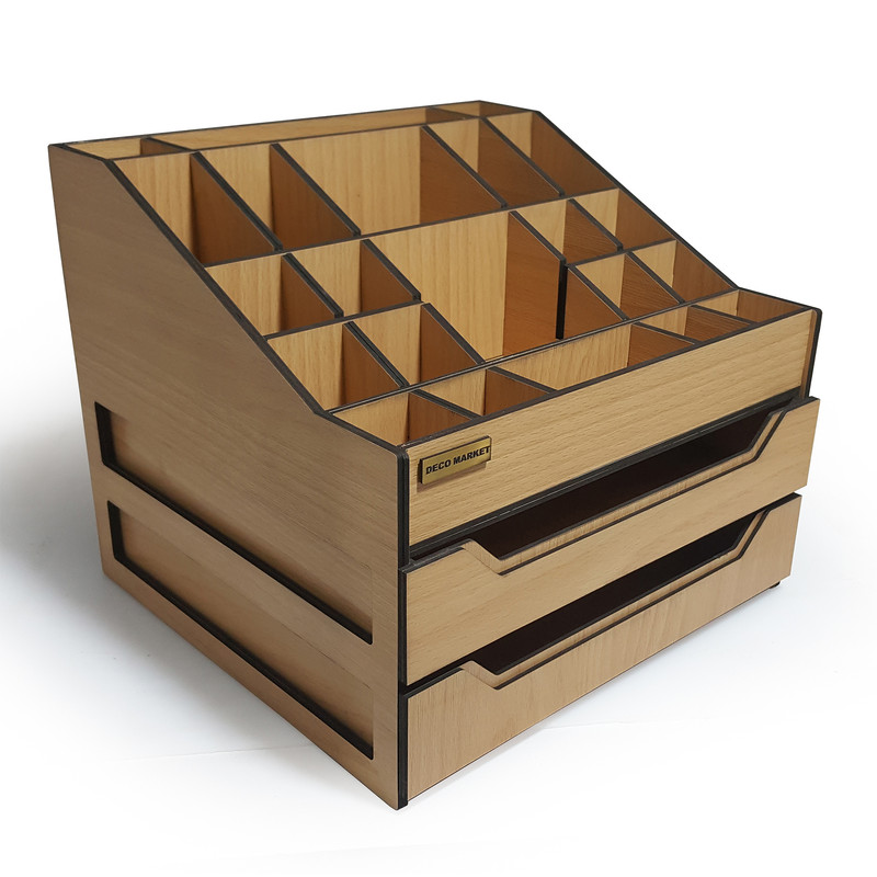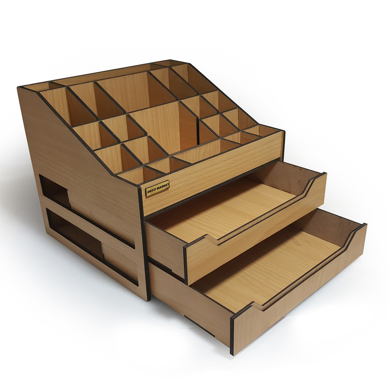 کازیه دارای 2 کشو با ضخامت 6 میلیمتری می باشد لازم به ذکر است این محصول را می توان به صورت یک لایه و با ضخامت 3 میلی متر نیز ساخت که در نتیجه جنس مصرفی و زمان ساخت و هزینه های تولید کننده نصف می شود اما گروه تولیدی کیفیت و استحکام را سرلوحه تولید خود قرار داده است. این محصول برای تمام لوازم آرایشی، ابزار و وسایل از جمله وسایل خیاطی، ابزار آچار و پیچ گوشتی، لوازم التحریر و تمام وسایلی که همواره بی نظم و روی میزها پخش هستند، قابل استفاده است.این جعبه کاملا تست شده و از نظر مقاومت کار نمره قابل قبولی گرفته و تقریبا برای هر شخصی یک عدد از این جعبه های نظم دهنده لازم و ضروری است.