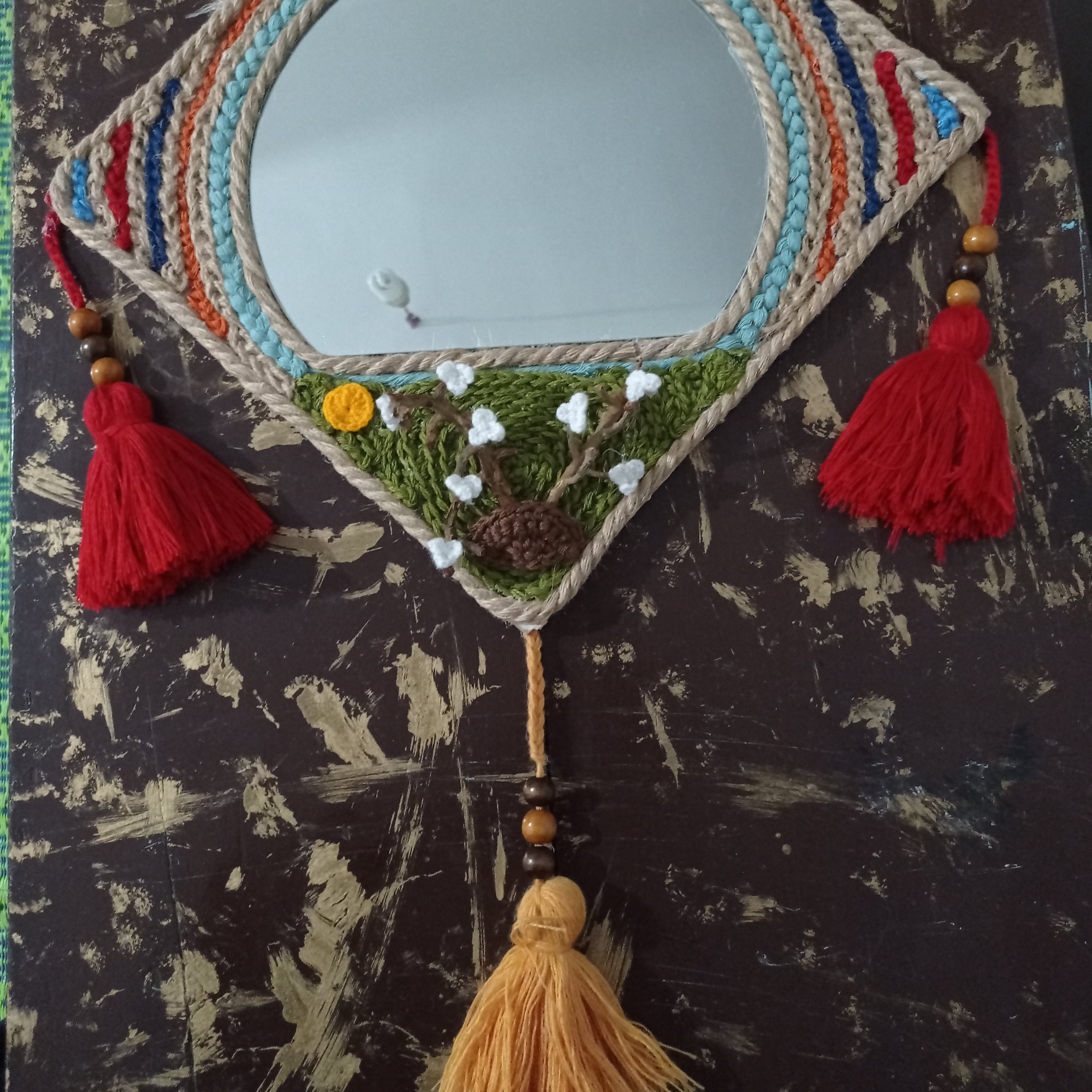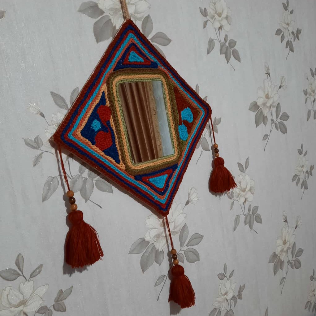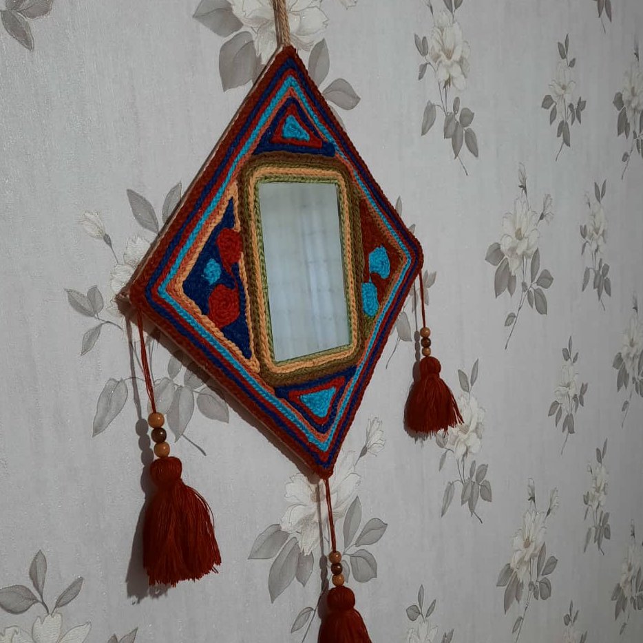 صفحه پشت آینه فیبر اماده شده با نخ مرینوس خاص و منحصر به فرد این اینه را میتوانید در کافه و رستورانهای سنتی و در منزل یا محل کار استفاده کنید و با دیدن این کار بخاطر رنگ بندی خاصش درشما ارامش خاصی بوجود می اورد