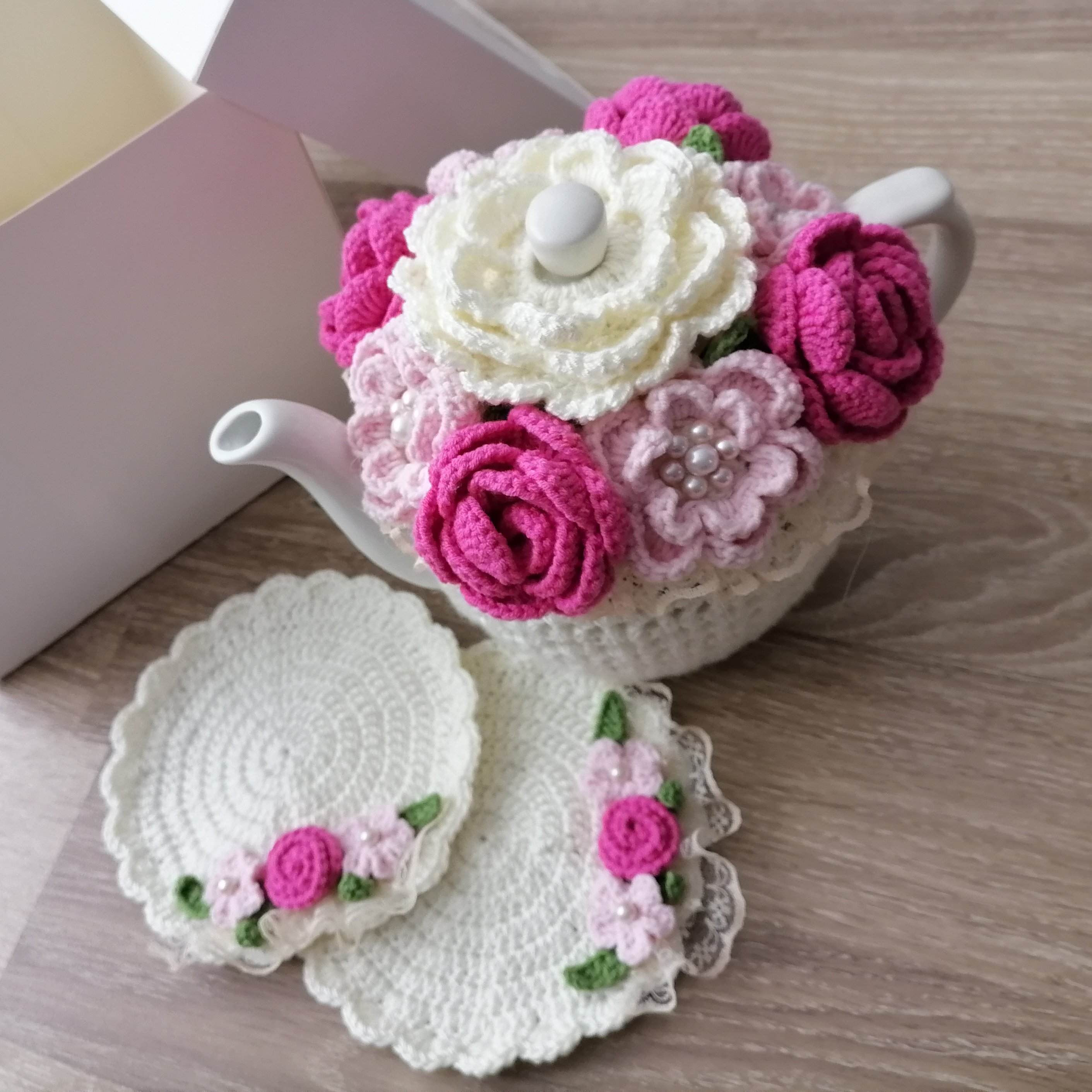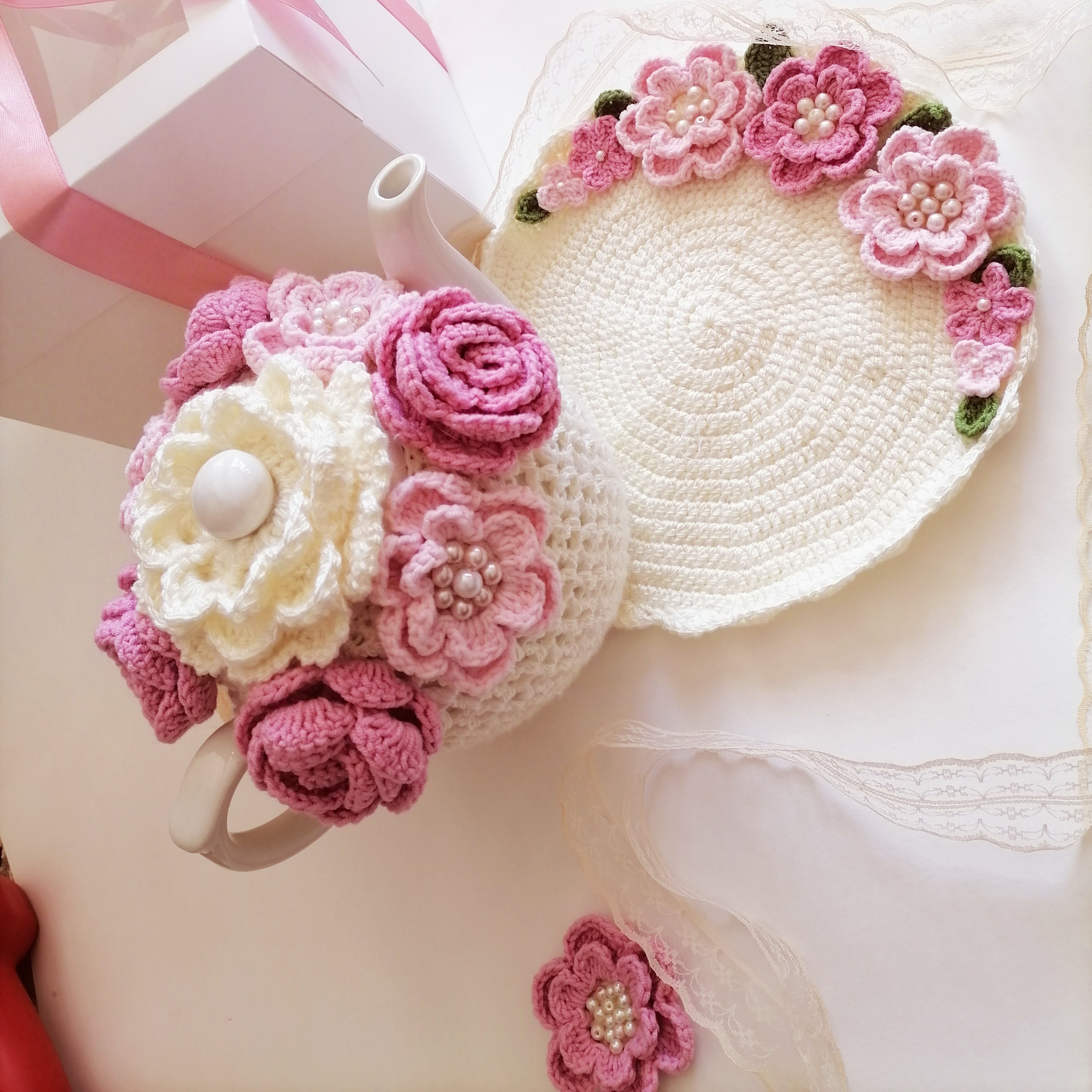 قوری همراه با ست زیر قوری و زیر لیوانی کاملا دستبافت و شیک مناسب جهیزیه مبلمونسرا مدل 297912