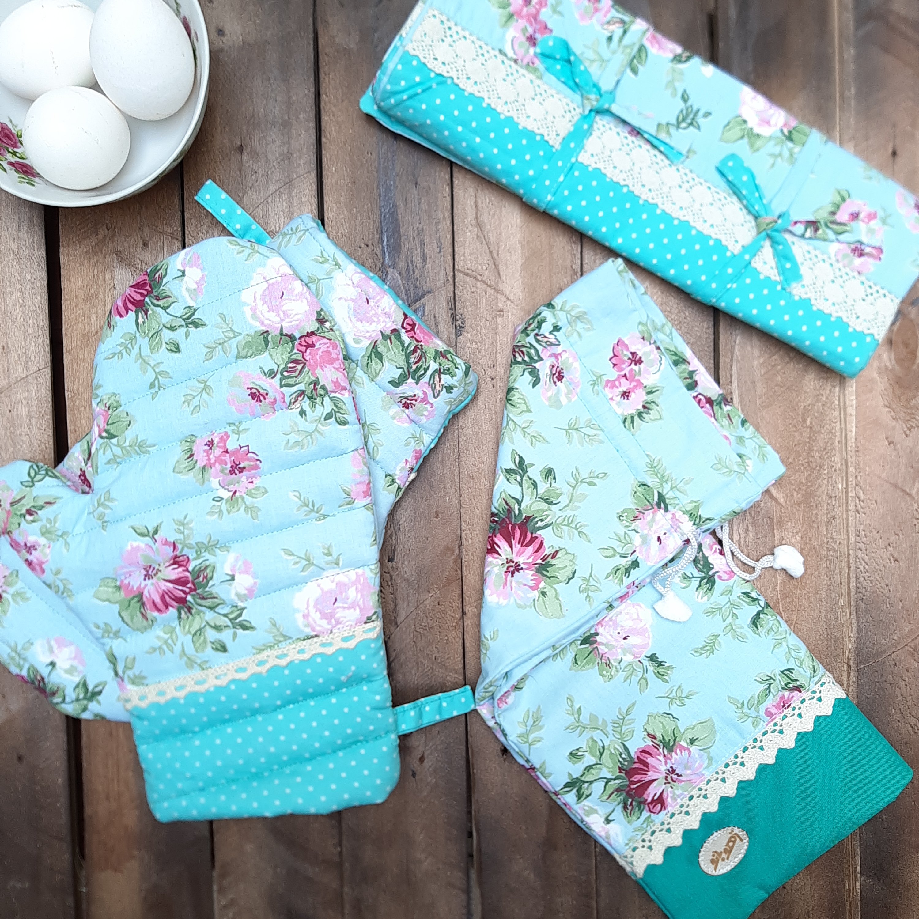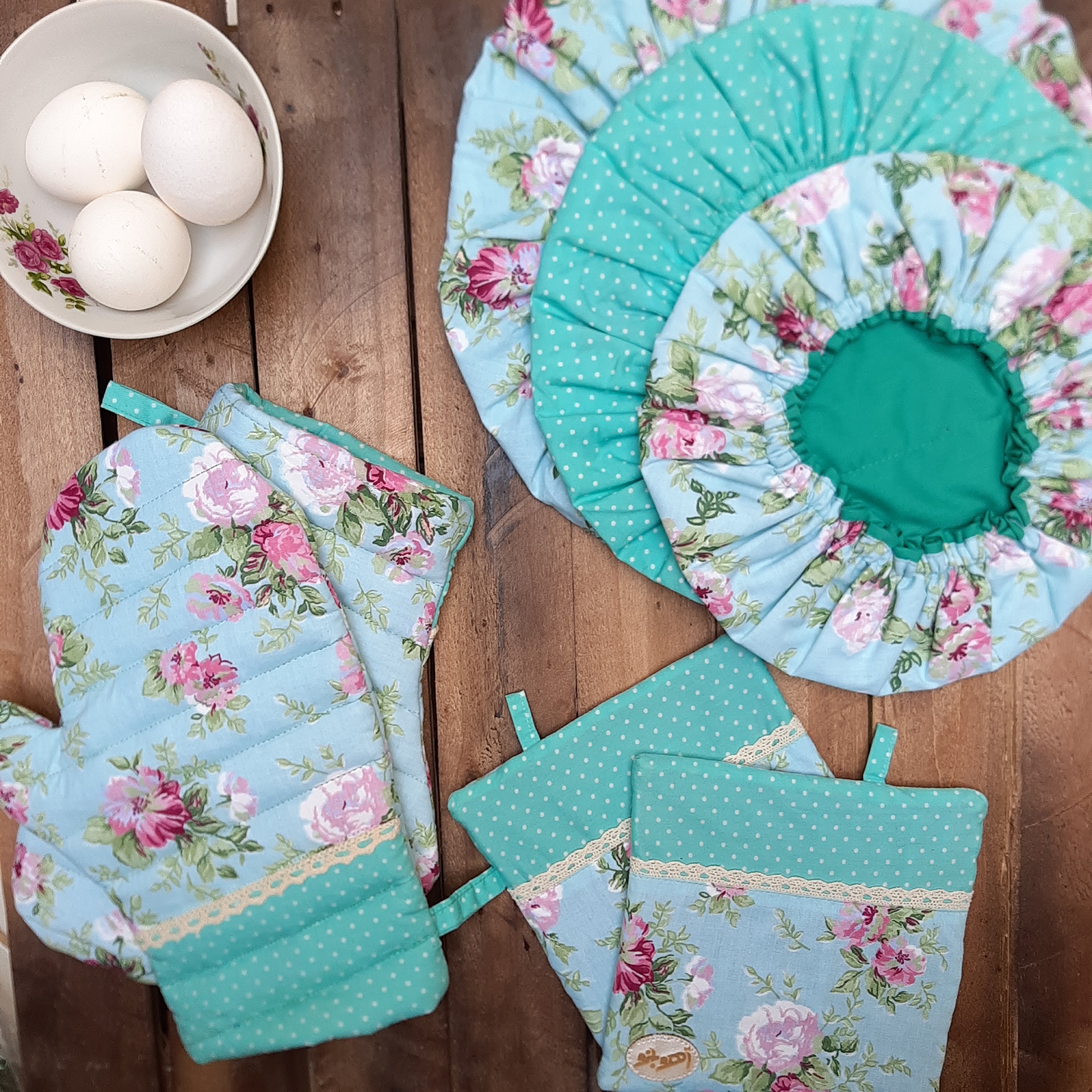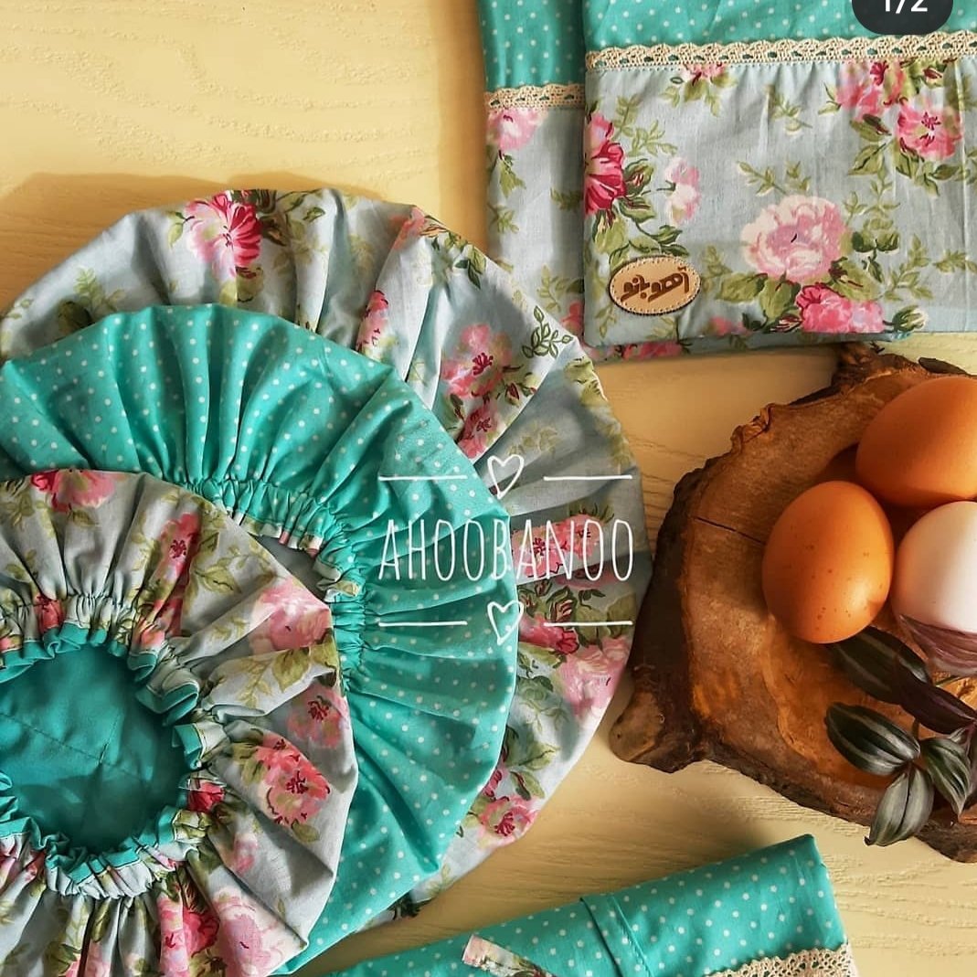ست کامل یه آشپزخونه شیک و جذاب 👌😍 یک ست با کیفیت ، لایه ی میانی دمکنی ، دستگیره و دستکش فر تماما از پارچه و نمد استفاده شده است.