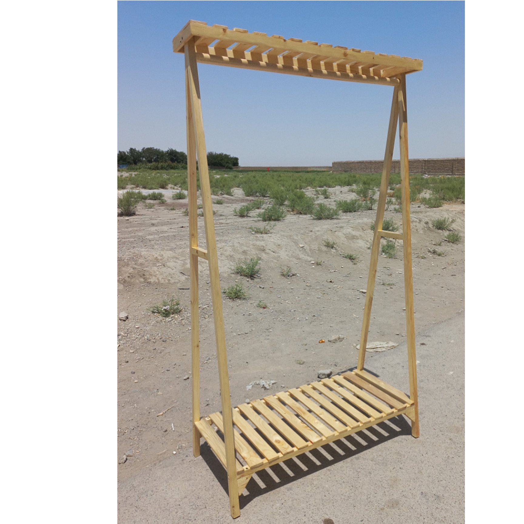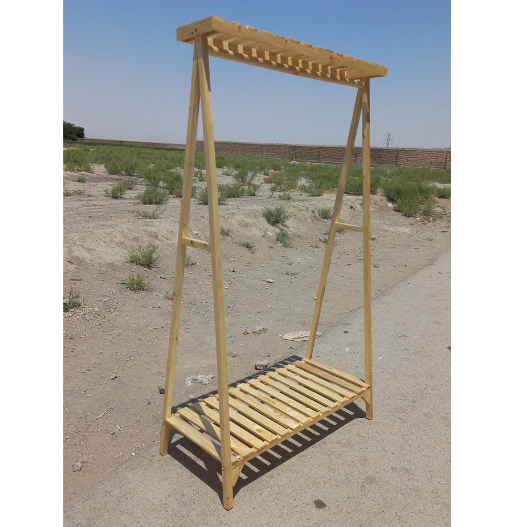 رگال لباس چوبی مدل مثلثی تک طبقه تاجدار رنگ کرم , رنگ خود چوب می باشد که جلا خورده است