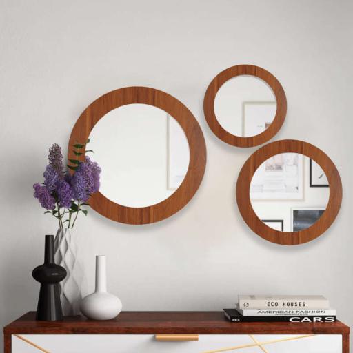 مجموعه 3 عددی گرد دلسا شامل 3 عدد آینه گرد چوبی که از طراحی و کیفیت منحصر به فردی برخوردار می باشد. این محصول تولید شده از ورق MDF وارداتی با روکش ملامینه می باشد که جلوه ی زیبایی را برای شما به ارمغان می آورد، پشت این محصول حفره ای به صورت مثلث طراحی شده که نصب آن را تنها به کمک یک میخ ریز آسان می کند. از این محصول می توانید برای دکوراسیون منزل یا محل کار، دیوارهای پشت مبل، کنسول، بالای جاکفشی و ... استفاده نمایید، درهنگام تحویل کالا به لوگوی ALEF در پشت هر آینه توجه فرمایید.
