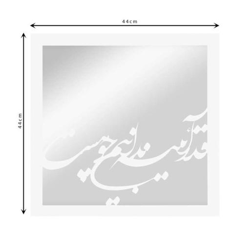 آینه مدل قدر آئینه از کیفیت و ظرافت منحصر به فردی برخوردار است. این محصول ساخته شده از ورق وارداتی MDF و آینه نقره اندود درجه A می باشد. در پشت محصول یک ورق یک تکه MDF به برده شده که در حفظ سلامت آینه نقش به سزایی ایفا می کند. در ورق پشت 3 حفره مثلثی شکل طراحی شده که می توان آن را به صورت تک میخ نصب نمود. \nابعاد این محصول 44cm x 44cm می باشد. از آن می توان برای دکوراسیون داخلی منزل یا محل کار، دیوارهای پشت مبل، میز کنسول، جاکفشی و... استفاده نمود.در هنگام تحویل کالا به نشان ALEF در پشت محصول توجه فرمایید. . متن تابلو: قدر آئینه ندانیم چو هست.