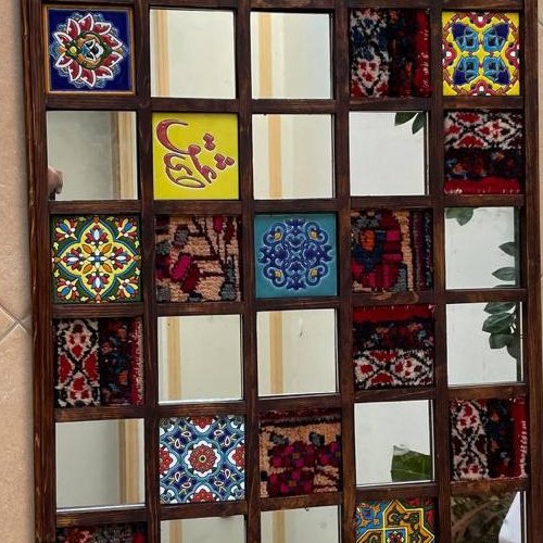 ترکیب چوب و اینه و فرش و کاشی کاشی طرح های متفاوت از دوره های مختلف تاریخی تیکه های فرش دستباف امکان سفارشی سازی ابعاد نمونه 65*125 ارسال بصورت از طریق ترمینال اتوبوس رانی و بر عهده مشتری