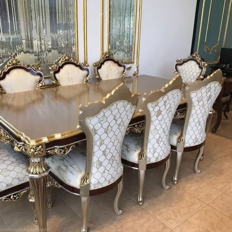 ارسال با باربری مدل کلاسیک نه نفره گلایول به خوبی میتواند درفضای پذیرایی خانه شما قرار بگیرد ومحیط خانه شما را زیبا وشکیل نشان دهد این مبل دارای نقش های منبت کاری شده و بسیار ظریف وزیبایی میباشد که مناسب خانواده های علاقه مندبه مبل کلاسیک باطراحی ظریف میباشد غذاخوری این ست درتعداد4_6_8نفره قابل سفارش است