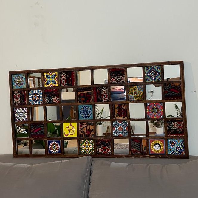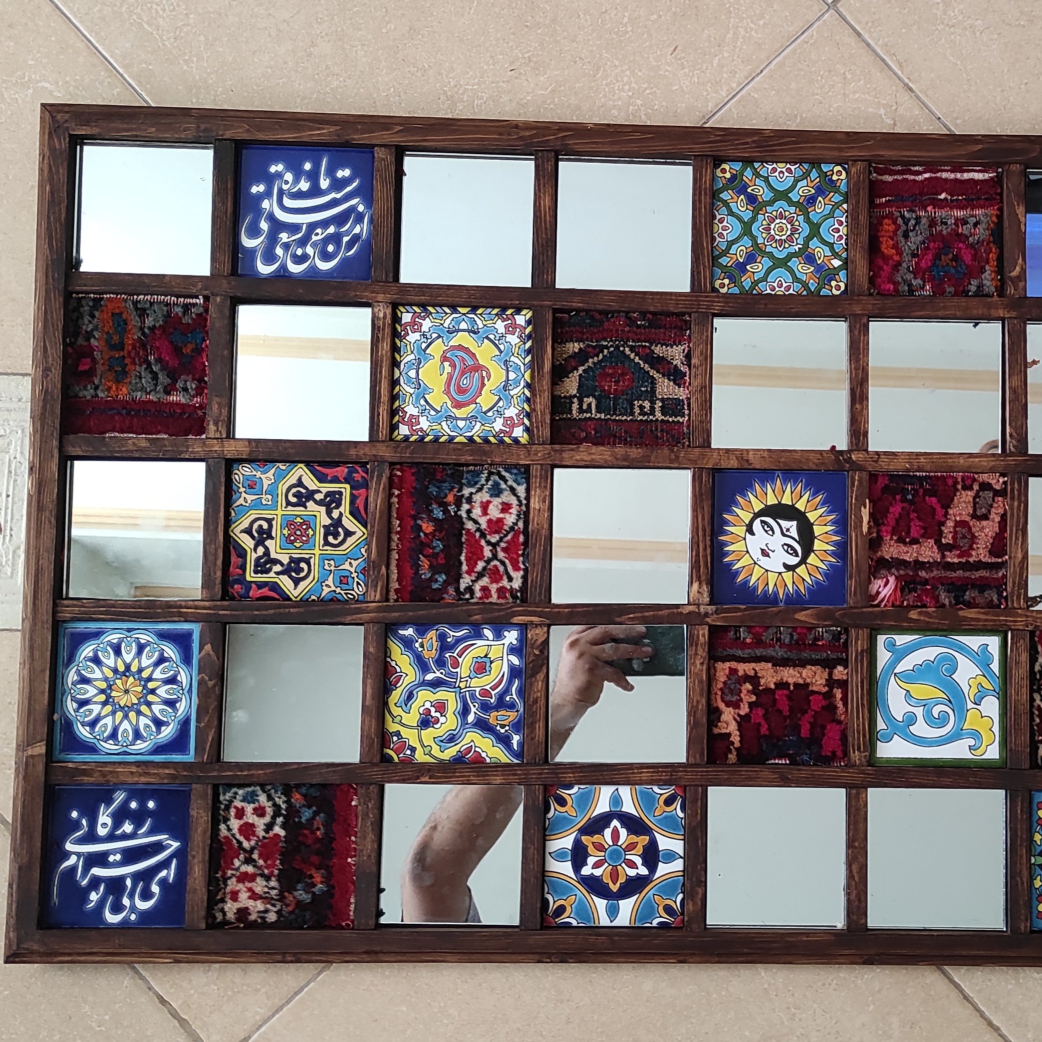 ترکیب چوب و اینه و فرش و کاشی کاشی طرح های متفاوت از دوره های مختلف تاریخی تیکه های فرش دستباف امکان سفارشی سازی ابعاد نمونه 65*۶۵ ارسال بصورت از طریق ترمینال اتوبوس رانی و بر عهده مشتری