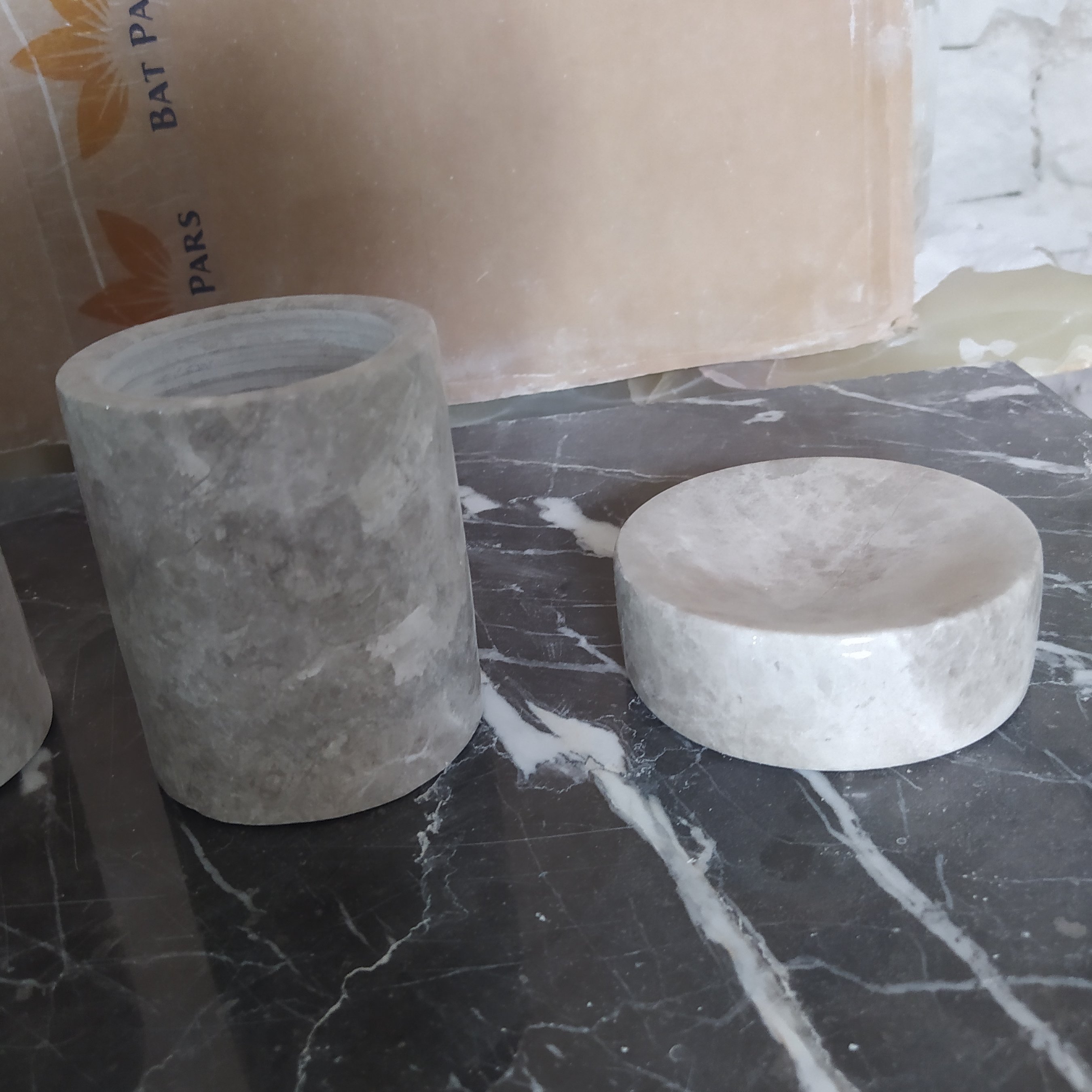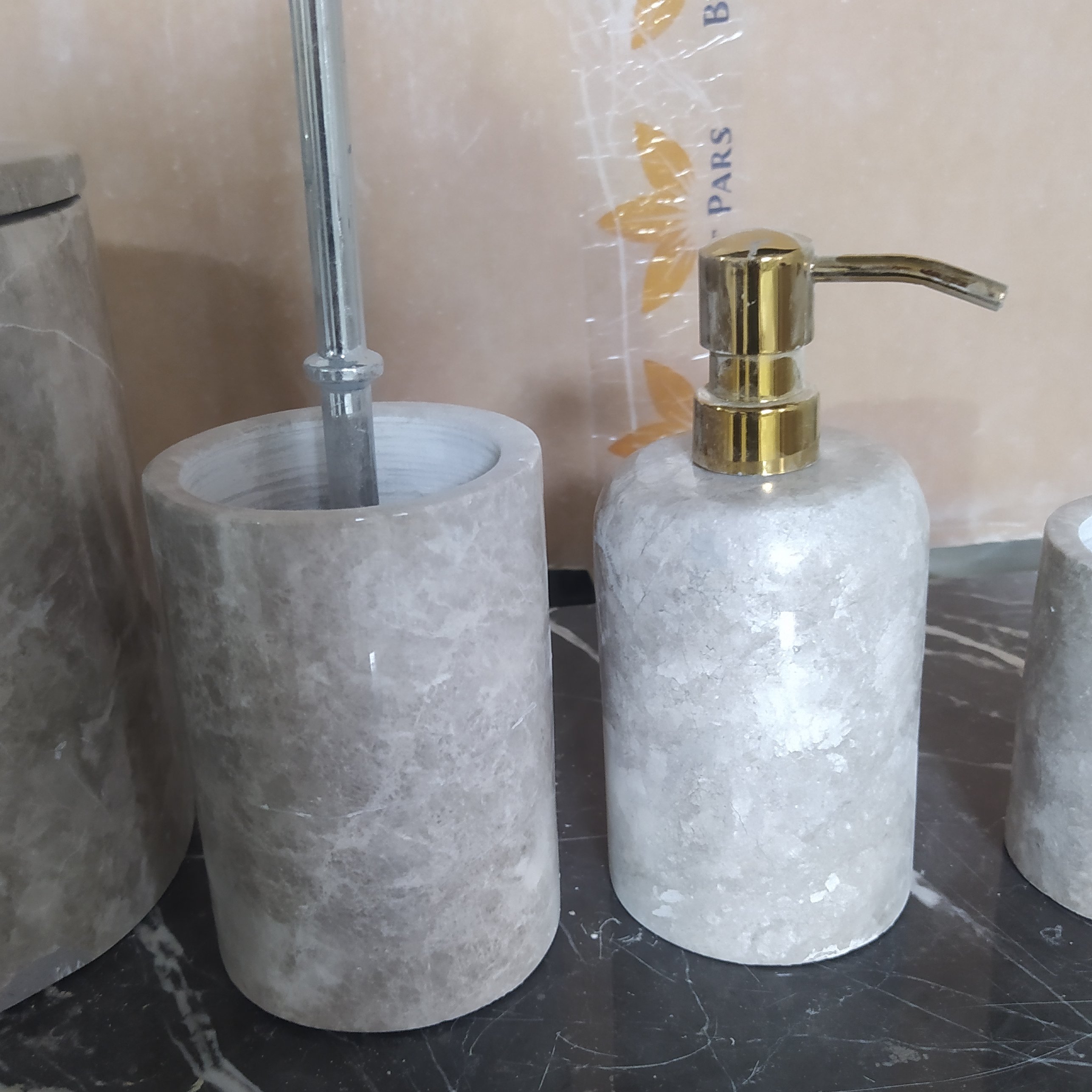ست سرویس بهداشتی تمام سنگ ۵ تکه شامل : سطل زباله ، جا مسواکی و خمیر دندان، جا مایع ، جا صابونی و جا فرچه سنگ مرمریت پرشین رنگ طوسی تمام سنگ طبیعی صاب و جلای عالی ساخته شده از مرغوبترین سنگ دکور شیک و مدرن برای فضای سرویس بهداشتی و حمام