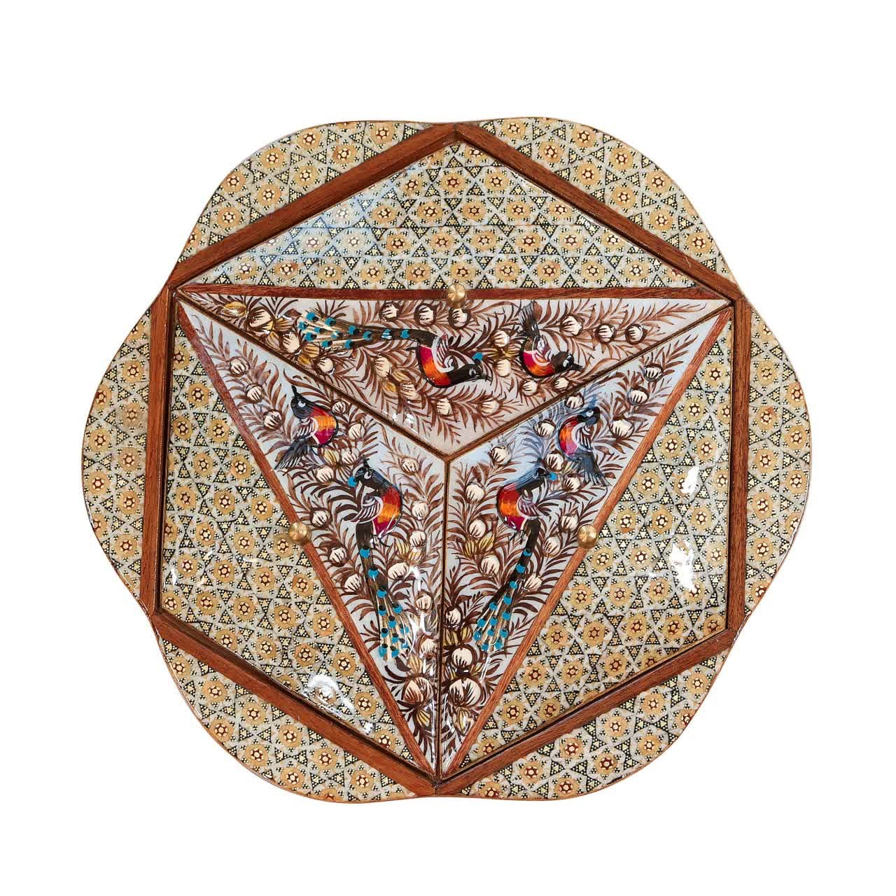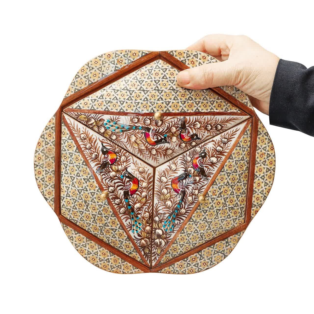 شکلات خوری ۳ درب بزرگ خاتم طرح گل و مرغ قهوهای یکی از کارهای نفیس و فاخر صنایع دستی اصفهان به فروش میرسد در خاتم کاری چوب ، استخوان یا فلز را به صورت منشورهای مثلث القاعده برش داده و آنها را به گونه ای کنار هم قرار می دهند که برش عرضی این مثلث های واحد، دارای اشکال هندسی منظم باشد سپس با سریش برش های نازک را با نظم و ترتیب خاصی روی ورقه نازک چوبی می چسبانند و پس از خشک شدن ورقه ها را روی اشیای مورد نیاز جهت تزئین نصب می کنند. انواع چوب از مهمترین مصالح خاتم سازی است که شامل چوب های عناب، نارنج، افرا، گردو، کیکم، تبریزی، شمشاد، آبنوس، فوفل و بتم است. انواع استخوان نیز به علت استحکام و رنگ سفید آنها در ساخت خاتم به کار می روند که عبارتند از استخوان های شتر، اسب، گاو، همچنین عاج طبیعی فیل و عاج مصنوعی نیز در خاتم کاربرد زیادی دارد