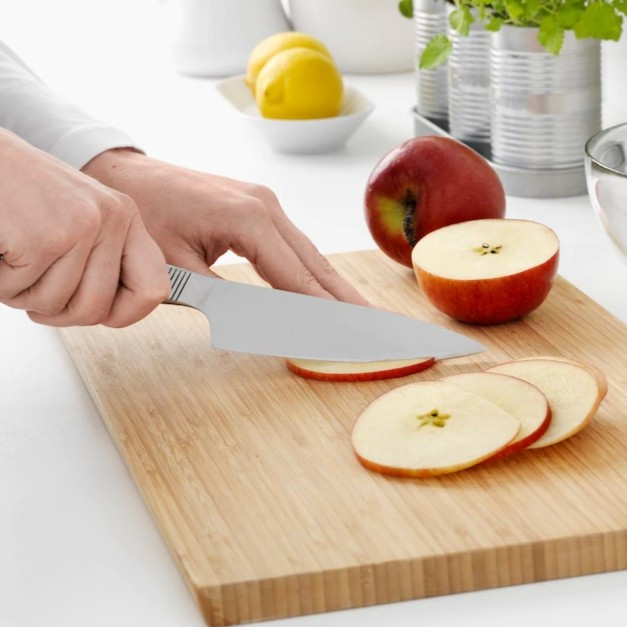 چاقوی استنلس استیل مدل IKEA 365+ با لبه های تیز ، مناسب برای برش مرغ ، نان ، سبزیجات ، گوجه فرنگی و میوه های نرم دیگر . این محصول دارای عمر طولانی مدت می باشد. این چاقوی از استنلس استیل ضد زنگ ساخته شده است. بسیار با دوام و متعادل می باشد و برای مدت طولانی تیز می ماند. شیار های روی دسته چاقوی باعث می شود که نگهداری آن راحت باشد.