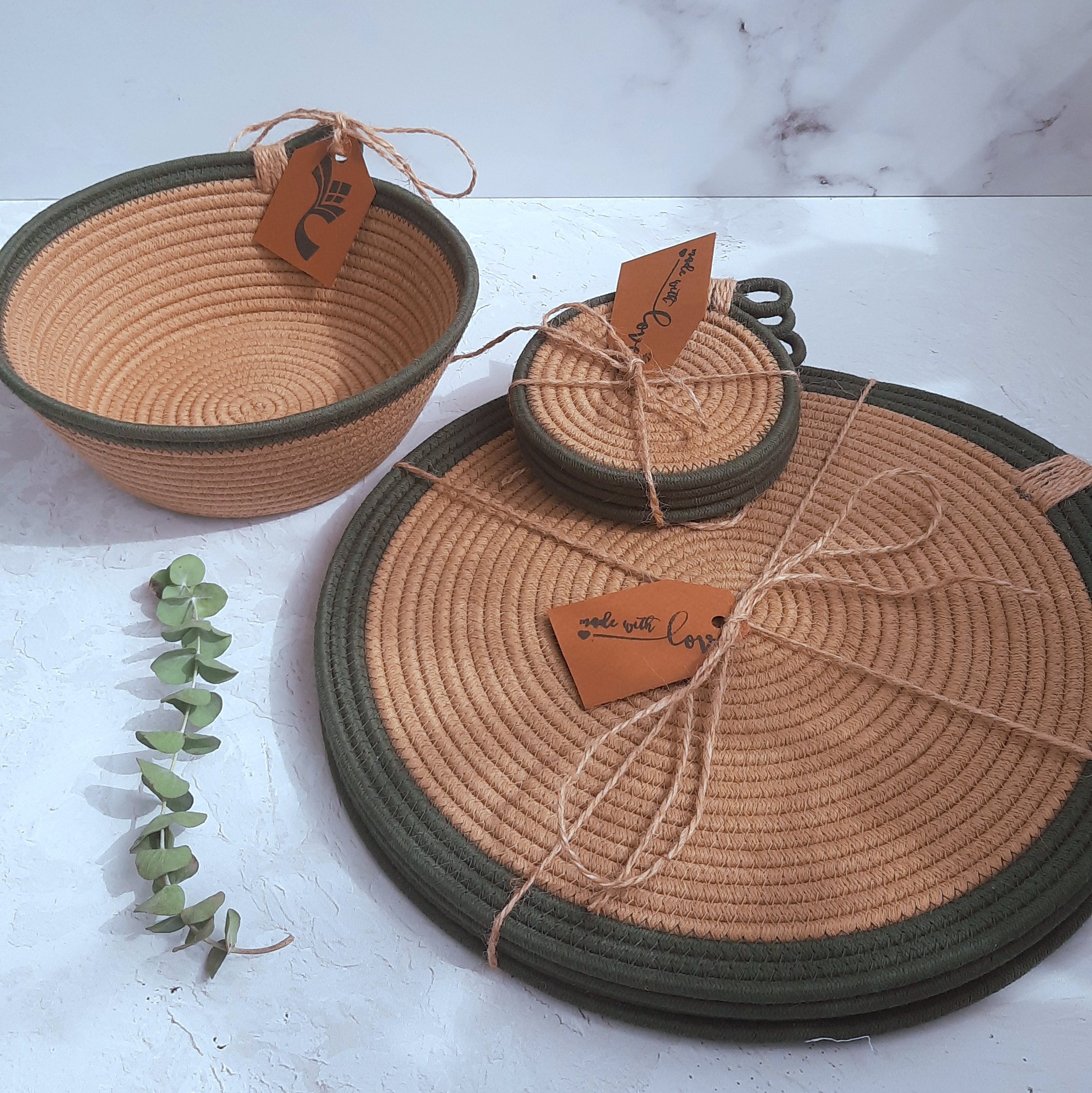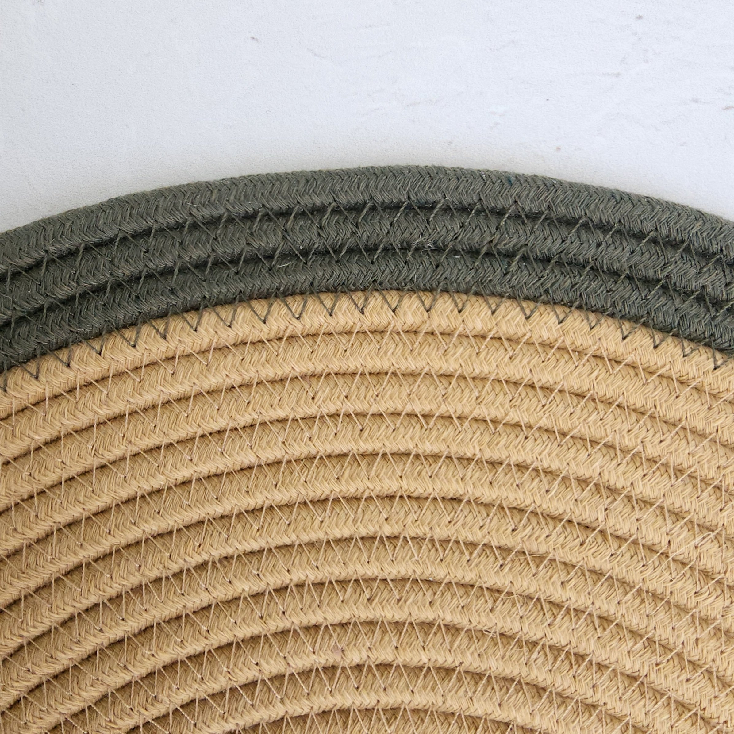 زیر بشقابی قیطان بافی ترکیب دو رنگ کنفی و سبز ارتشی